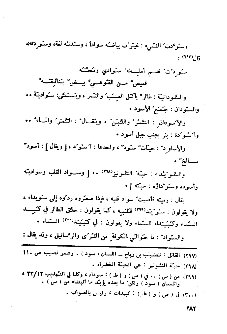 والسودانية: طائرٌ يأكُل العِنَبَ والتّمر، ويُسَمَّى: سُواديّة. والسّودان: جَمعُ الأسود. والأَسودانِ: التَّمْرُ واللَّبَنُ. ويُقالُ: التَّمرُ والماءُ. وأَسْوَدة: بئر بجنب جبل أسود. والأساوِدُ: حيّاتٌ سُودٌ، واحدها: أَسْوَد، [ويقال] : أسود سالخٌ. والسُّوَيْداء: حبّةُ الشُّونيز «298» . [وسواد القلب وسواديه وأسوده وسوداؤه: حبّته] . يقال: رميته فأصبتُ سواد قلبه، فإذا صغّروه ردّوه إلى سٌويداء، ولا يقولون: سٌوَيْد «299» قَلبِه، كما يقولون: حلَّق الطائر في كبد السماء وكبيداء السماء ولا يقولون: في كُبَيد «300» السّماء. والسّوادُ: ما حَوالَي الكوفةِ من القُرَى والرَّساتيق، وقد يقال: