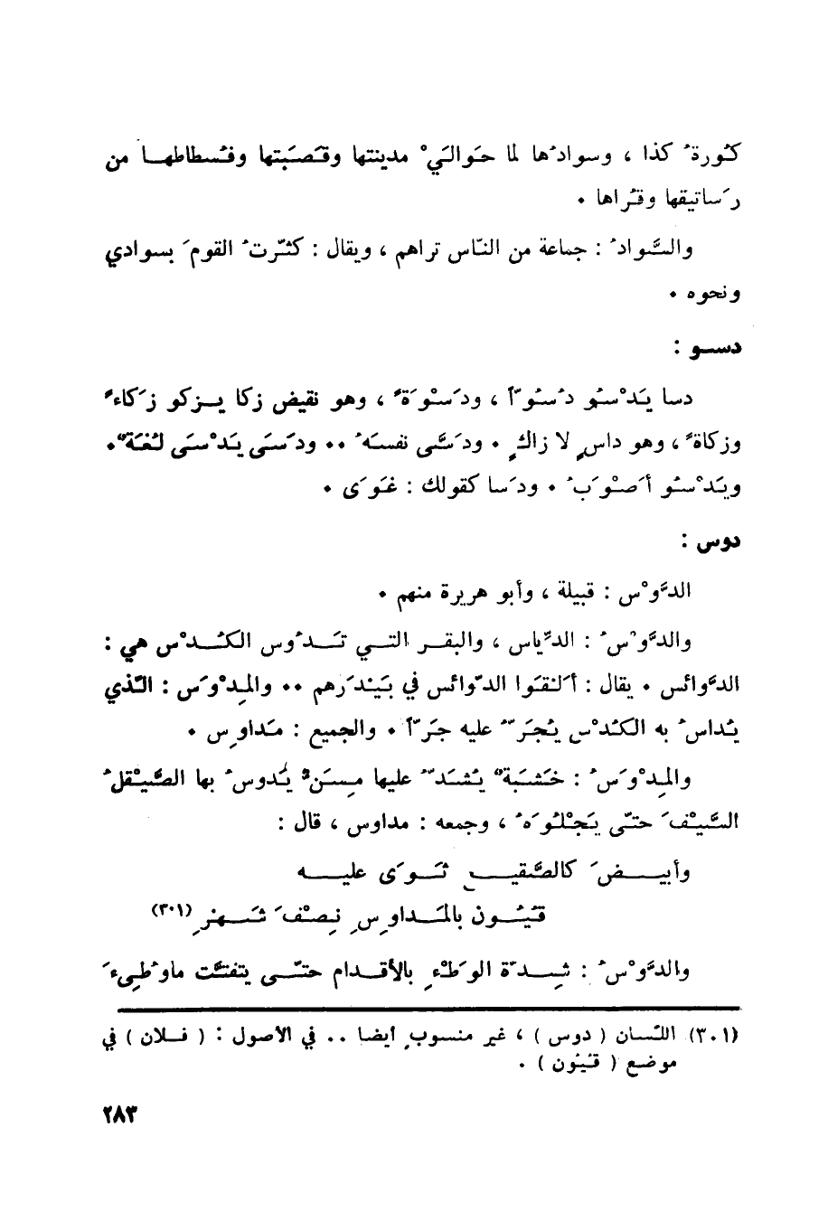 (301) اللسان (دوس) ، غير منسوب أيضا.. في الأصول: (فلان) في موضع (قيون) .