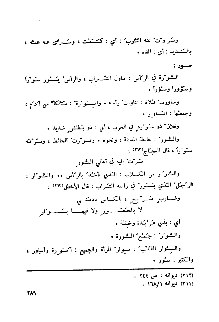 سور: السَّوْرة في الرّأس: تناول الشّراب، والرأسُ يَسُور سَوْراً وسُؤوراً وسُؤراً. وساورتُ فُلانا: تناولتُ رأسه. والمِسوَرةُ: مُتَّكأٌ من أَدَم، وجمعُها: المَساوِر. وفلانٌ ذو سَوْرةٍ في الحرب، أي: ذو بَطْشٍ شديد. والسُّورُ: حائطُ المدينة، ونحوه. وتسوّرتُ الحائط، وسُرْتُه سَوْراً، قال العجّاج: «313»