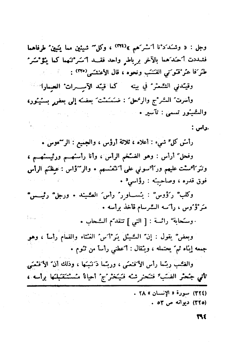 رأس: رأسُ كلِّ شيء: أعلاه، ثلاثة أرؤس، والجميع: الرؤوس. وفحلٌ أرأس: وهو الضّخم الرأس، وأنا رأسُهم ورئيسُهم، وتَرَأَّسْت عليهم ورَأَّسوني على أَنْفُسهم. والرُّؤاس: عِظَم الرأس فوق قدره، وصاحِبُه: رؤاسيٌّ. وكلبٌ رَؤوسٌ: يُساوِرُ رأسَ الصَّيد. ورجلٌ رئيسٌ مَرْؤوُس، رأَسه السِّرسام فأخذ برأسه. وسَحابةٌ رائسة: [التي] تتقدّم السَّحاب. وبعضٌ يقول: إنّ السَّيْل يَرْأَسُ الغُثاء والقمام رأساً، وهو جمعه إيّاه ثمّ يحتمله، ويُقال: أَعطني رأساً من ثُوم. والضَّب ربّما رأس الأَفعَى، وربّما ذَنَبَها، وذلك أنّ الأَفْعَى تأتي جُحْر الضّبِّ فتَحرِشُه فيَخْرُجُ أحياناً مُسْتَقَبلَها براسه،