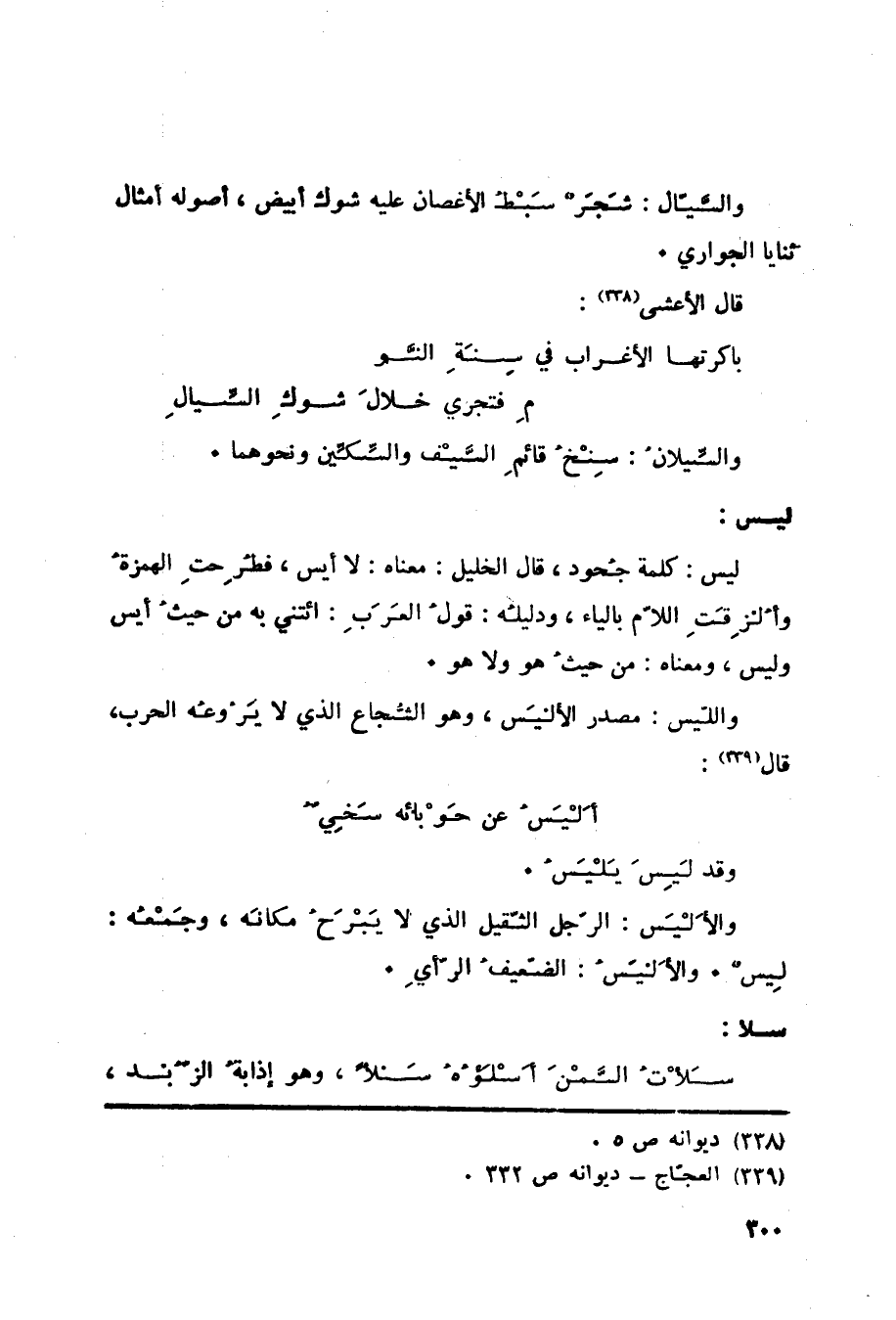 ليس: ليس: كلمة جُحود، قال الخليل: معناه: لا أيس، فطُرِحتِ الهمزةُ وأُلزِقَتِ اللاّم بالياء، ودليلُه: قولُ العَرَبِ: ائتني به من حيث أيس وليس، ومعناه: من حيثُ هو ولا هو. واللّيس: مصدر الأليَس، وهو الشُّجاع الذي لا يَروعُه الحرب، قال «339» :