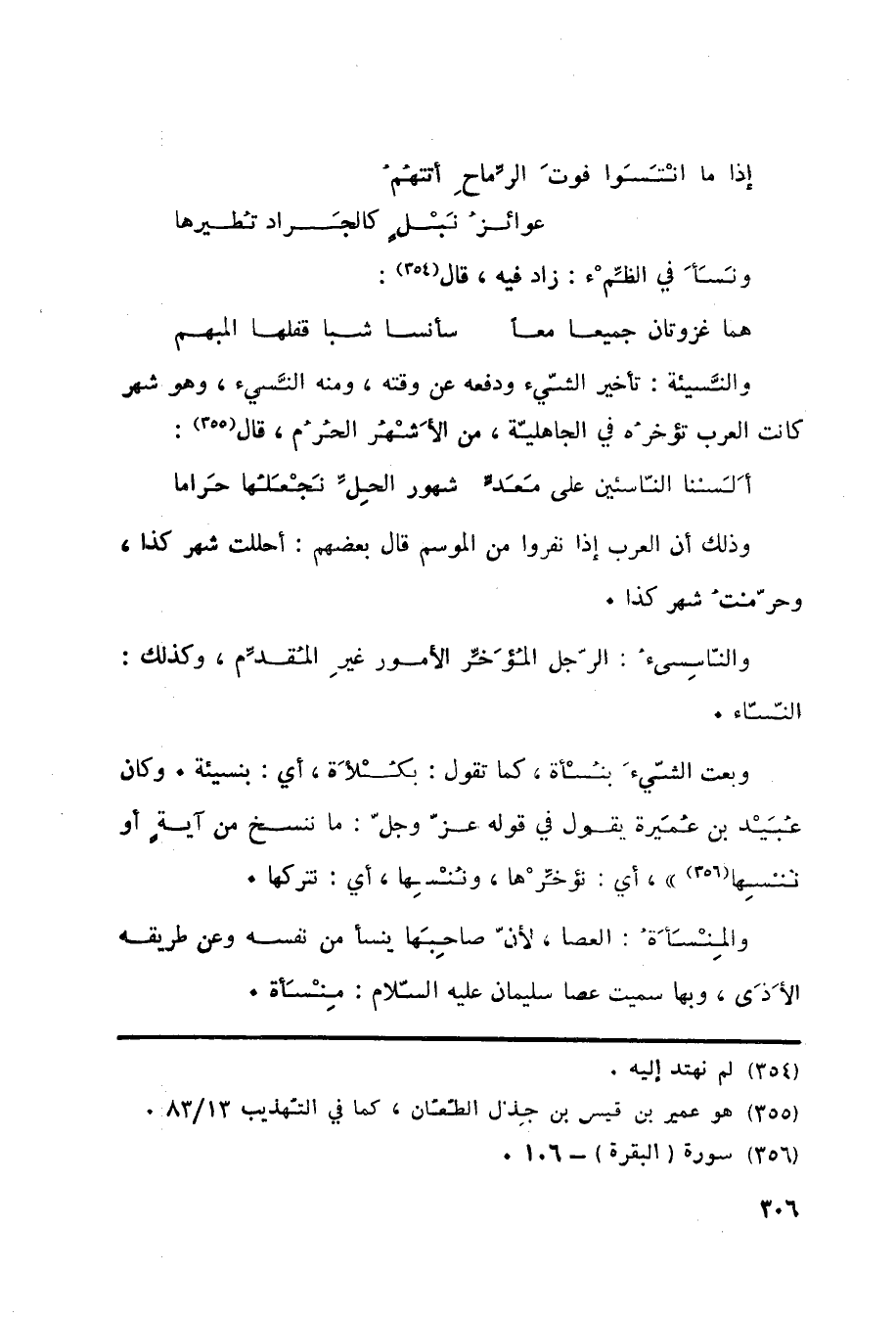 وذلك أن العرب إذا نفروا من الموسم قال بعضهم: أحللت شهر كذا، وحرمت شهر كذا. والناسىء: الرجل المؤخر الأمور غيرِ المُقدِّم، وكذلك: النّسّاء. وبعت الشّيءَ بنُسْأة، كما تقول: بكُلأَة، أي: بنسيئة. وكان عُبَيْد بن عُمَيرة يقول في قوله عزّ وجلّ: ما نَنْسَخْ مِنْ آيَةٍ أَوْ نُنْسِها