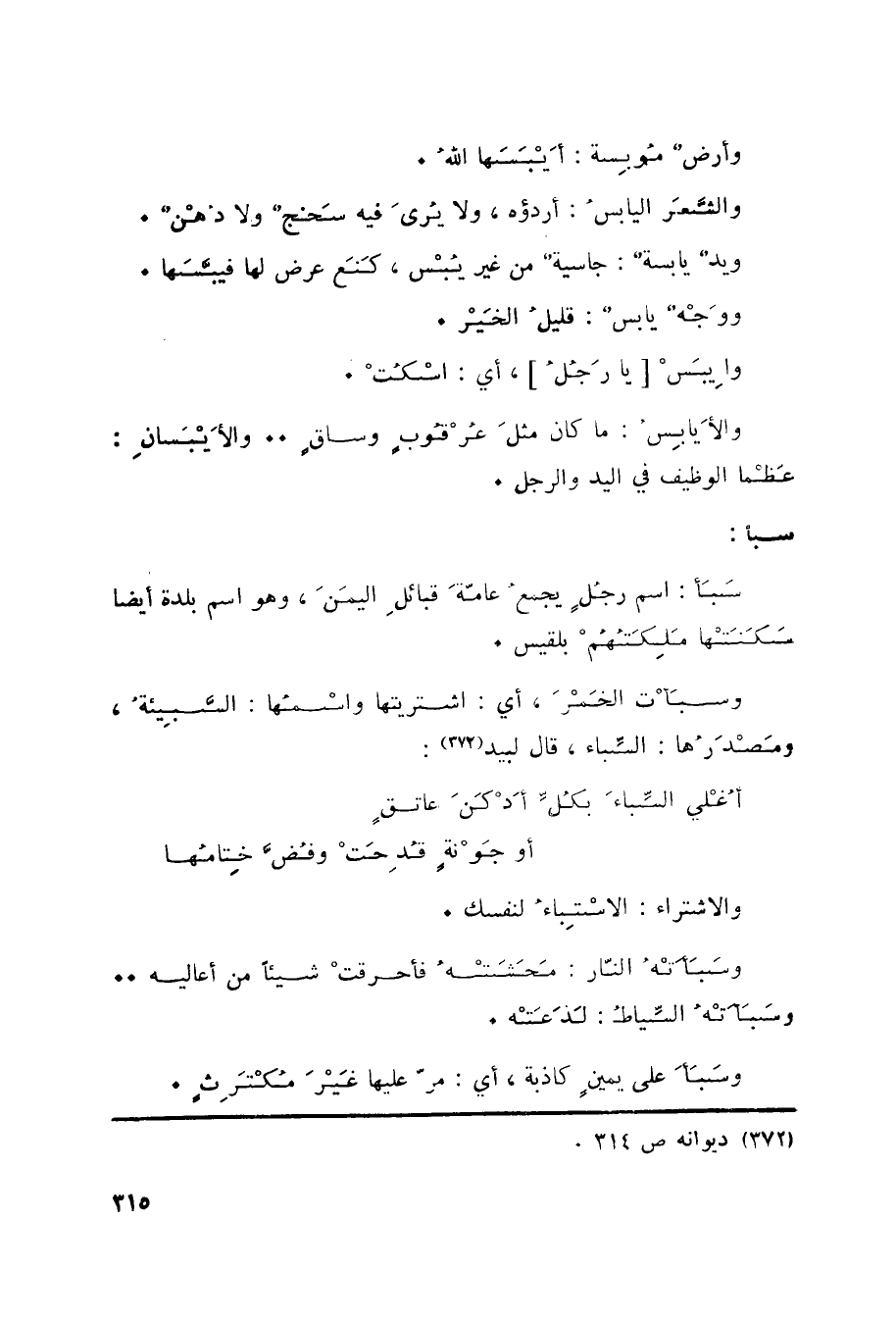 سبأ: سَبَأ: اسم رجُلٍ يجمعُ عامّةَ قبائلِ اليمَنَ، وهو اسم بلدة أيضاً سَكَنَتْها مَلِكَتُهُمْ بلقيس. وسبَأْت الخَمْرَ، أي: اشتريتها واسْمُها: السَّبِيئةُ، ومَصْدرُها: السِّباء، قال لبيد: «372»