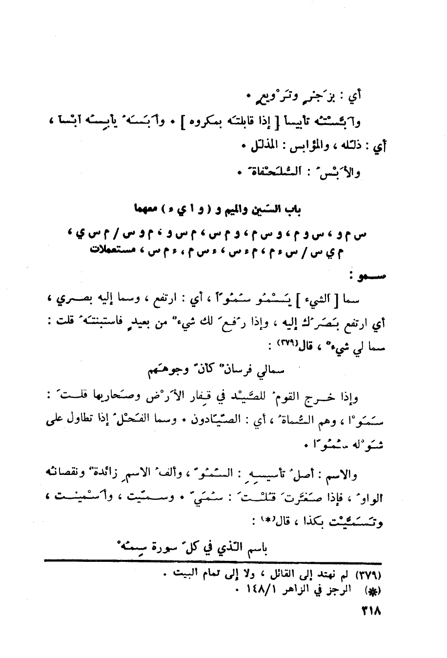 وإذا خرج القومُ للصَّيْد في قِفار الأَرْض وصَحاريها قلتَ: سَمَوْا، وهم السُّماةُ، أي: الصّيّادون. وسما الفَحْلُ إذا تطاول على شَوْله سُمُوّاً. والاسم: أصلُ تأسيسِهِ: السُمُوّ، وألفُ الاسمِ زائدةٌ ونقصانُه الواوُ، فإذا صَغَّرتَ قُلْتَ: سُمَيّ. وسمّيت، وأَسْميت، وتَسَمَّيْت بكذا، قال «380» :