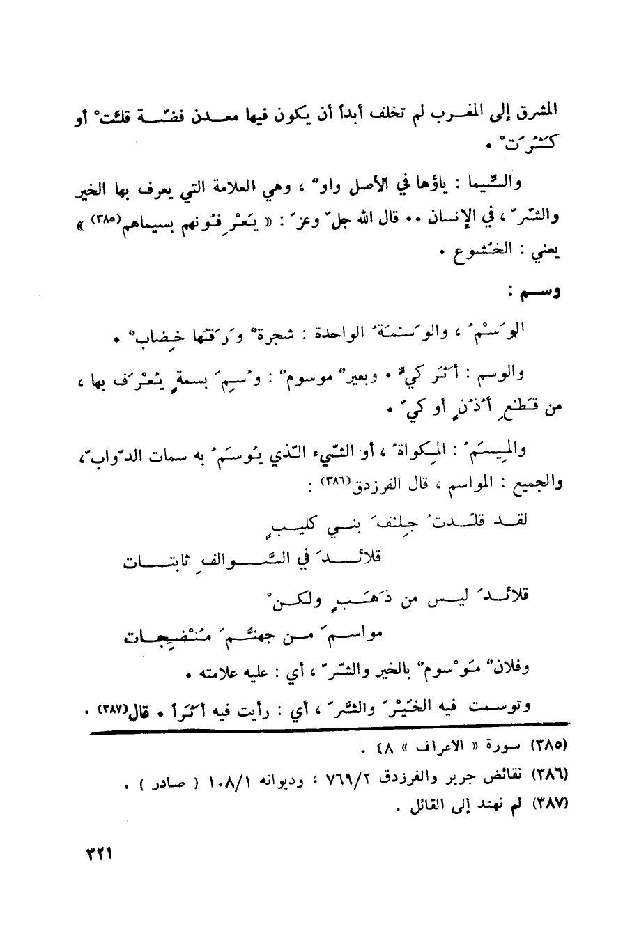 المشرق إلى المغرب لم تخلف أبداً أن يكون فيها معدن فضّة قلَّتْ أو كَثُرَتْ. والسِّيما: ياؤها في الأصل واوٌ، وهي العلامة التي يعرف بها الخير والشّرّ، في الإنسان. قال الله جل وعز: يَعْرِفُونَهُمْ بِسِيماهُمْ «386» يعني: الخُشوع.