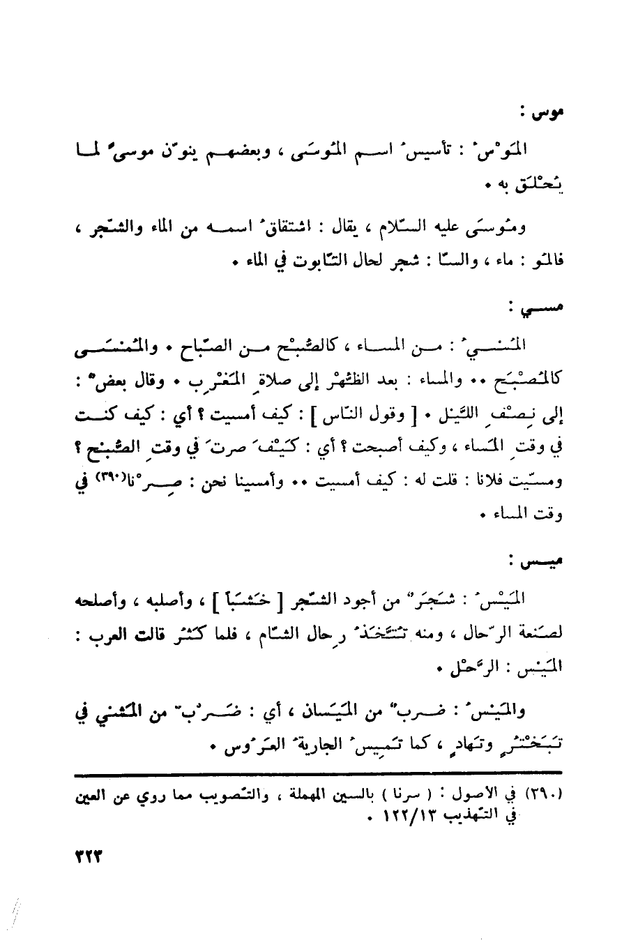 موس: المَوْسُ: تأسيسُ اسم المُوسَى، وبعضهم ينوّن موسىً لما يُحْلَق به. ومُوسَى عليه السّلام، يقال: اشتقاقُ اسمه من الماء والشّجر، فالمُو: ماء، والسّا: شجر لحال التّابوت في الماء.