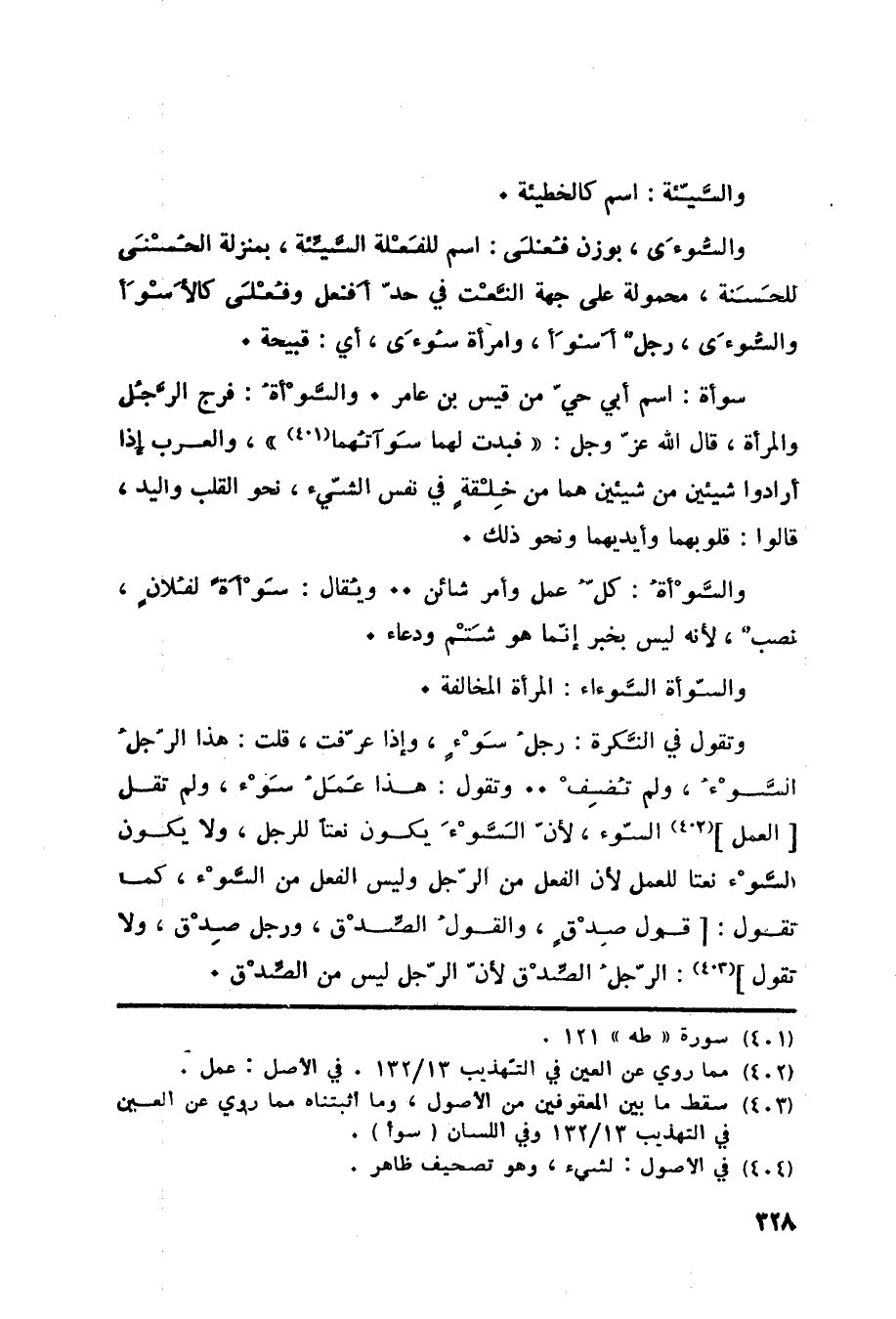 والسَّيّئة: اسم كالخطيئة. والسُّوءَى، بوزن فُعلَى: اسم للفَعْلة السَّيِّئة، بمنزلة الحُسْنَى للحَسَنة، محمولة على جهة النَّعْت في حدّ أّفعل وفُعْلَى كالأَسْوَأ والسُّوءَى، رجلٌ أَسوَأ، وامرأة سُوءَى، أي: قبيحة. سوأة: اسم أبي حيّ من قيس بن عامر. والسَّوْأةُ: فرج الرَّجُل والمراة، قال الله عز وجل: فَبَدَتْ لَهُما سَوْآتُهُما «402» ، والعرب إذا أرادوا شيئين من شيئين هما من خِلْقةٍ في نفس الشّيء، نحو القلب واليد، قالوا: قلوبهما وايديهما ونحو ذلك. والسَّوْأةُ: كلُّ عمل وأمر شائن.. ويُقال: سَوْأَةً لفُلانٍ، نصبٌ، لأنه ليس بخبر إنّما هو شَتْم ودعاء. والسّوأة السَّوءاء: المرأة المخالفة. وتقول في النَّكرة: رجلُ سَوْءٍ، وإذا عرّفت، قلت: هذا الرجل السَّوْءُ، ولم تُضِفْ.. وتقول: هذا عَمَلُ سَوْء، ولم تقل [العمل] «403» السّوء، لأنّ السَّوْءَ يكون نعتاً للرجل، ولا يكون السَّوْء نعتاً للعمل لأن الفعل من الرّجل وليس الفعل من السَّوْء، كما تقول: [قول صِدْقٍ، والقولُ الصِّدْق، ورجل صِدْق، ولا تقول] «404» : الرّجلُ الصِّدْق لأنّ الرّجل ليس من الصدق.