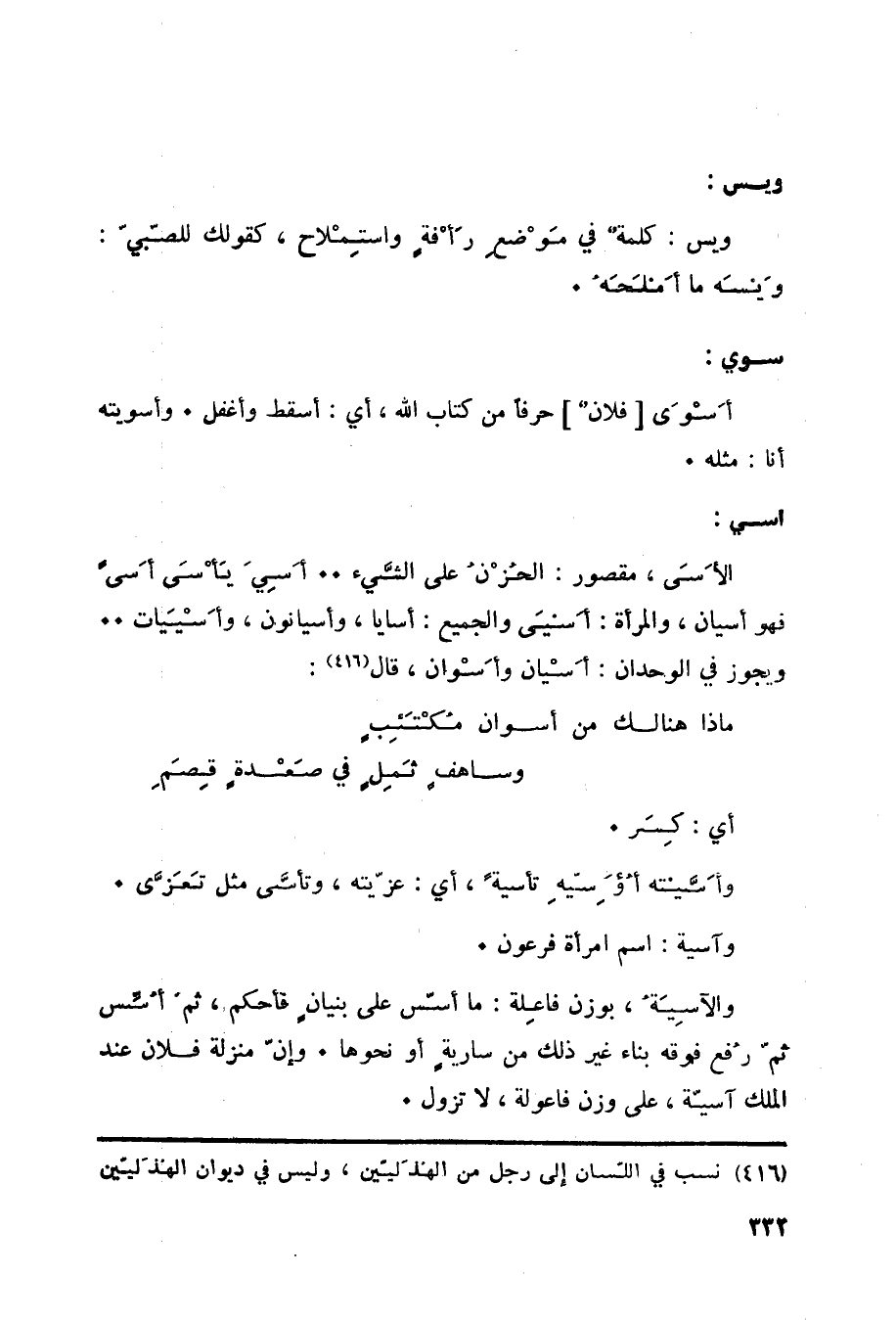 أي: كِسَر. وأَسَّيته أُؤَسِيّهِ تأسيةً، أي: عزّيته، وتأسَّى مثل تَعَزَّى. وآسية: اسم امرأة فرعون. والآسِيَةُ، بوزن فاعِلة: ما أسّس على بنيانٍ فأحكم، ثمّ أسس ثم رفع فوقه بناء غير ذلك من ساريةٍ أو نحوها. وإنّ منزلة فلان عند الملك آسية، على وزن فاعولة، لا تزول.