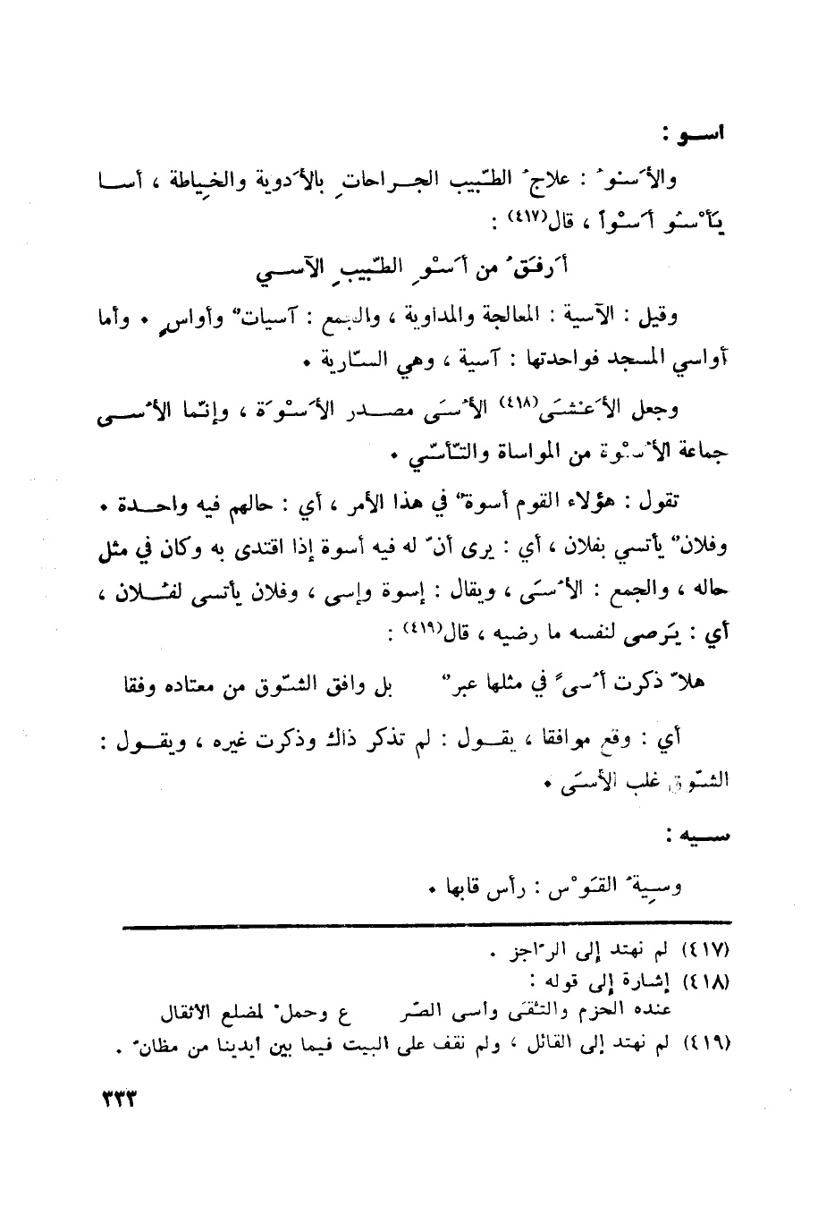 أسو: والأَسوُ: علاجُ الطّبيب الجراحاتِ بالأَدوية والخِياطة، أسا يَأْسُو أَسْواً، قال «418» :
