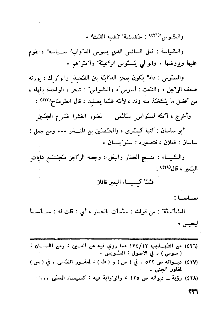 أبو ساسان: كنية كِسْرى، والحُصَين بن المنذر ... ومن جعل: ساسان: فعلان، فتصغيره: سُوَيْسان. والسِّيساء: منسج الحمار والبغل، وجعله الرّاجز مُجتَمع داياتِ البَعير، قال «429» :