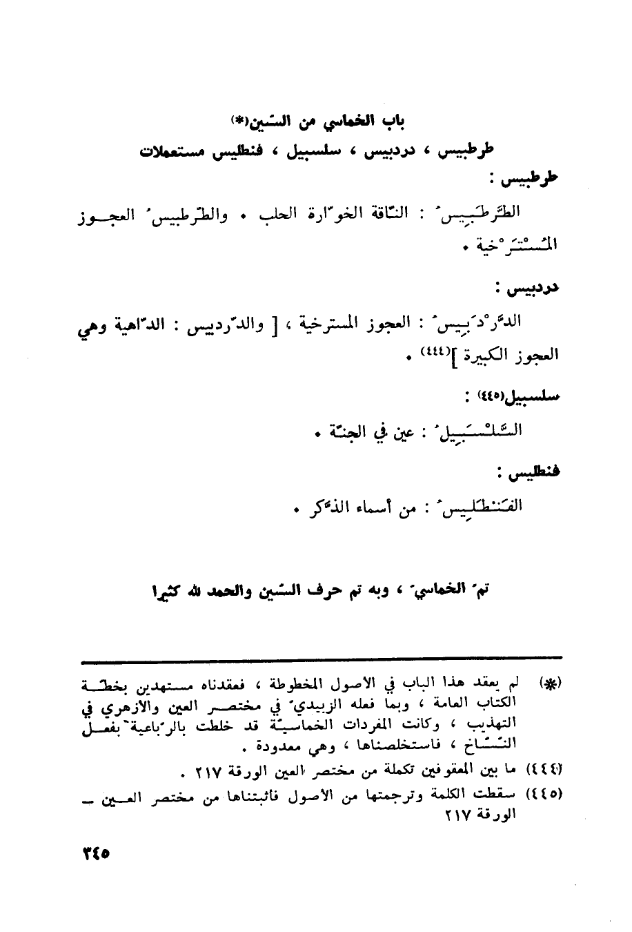 (445) لم يعقد هذا الباب في الأصول المخطوطة، فعقدناه مستهدين بخطة الكتاب العامة، وبما فعله الزبيدي في مختصر العين والأزهري في التهذيب، وكانت المفردات الخماسية قد خلطت بالرباعية بفعل النساخ، فاستخلصناها، وهي معدودة.