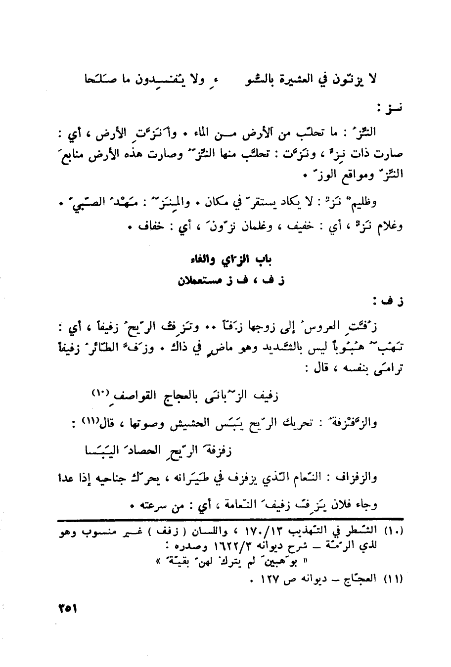 (10) الشطر في التهذيب 13/ 170، واللسان (زفف) غير منسوب وهو (لذي الرمة) شرح ديوانه 3/ 1622 وصدره: