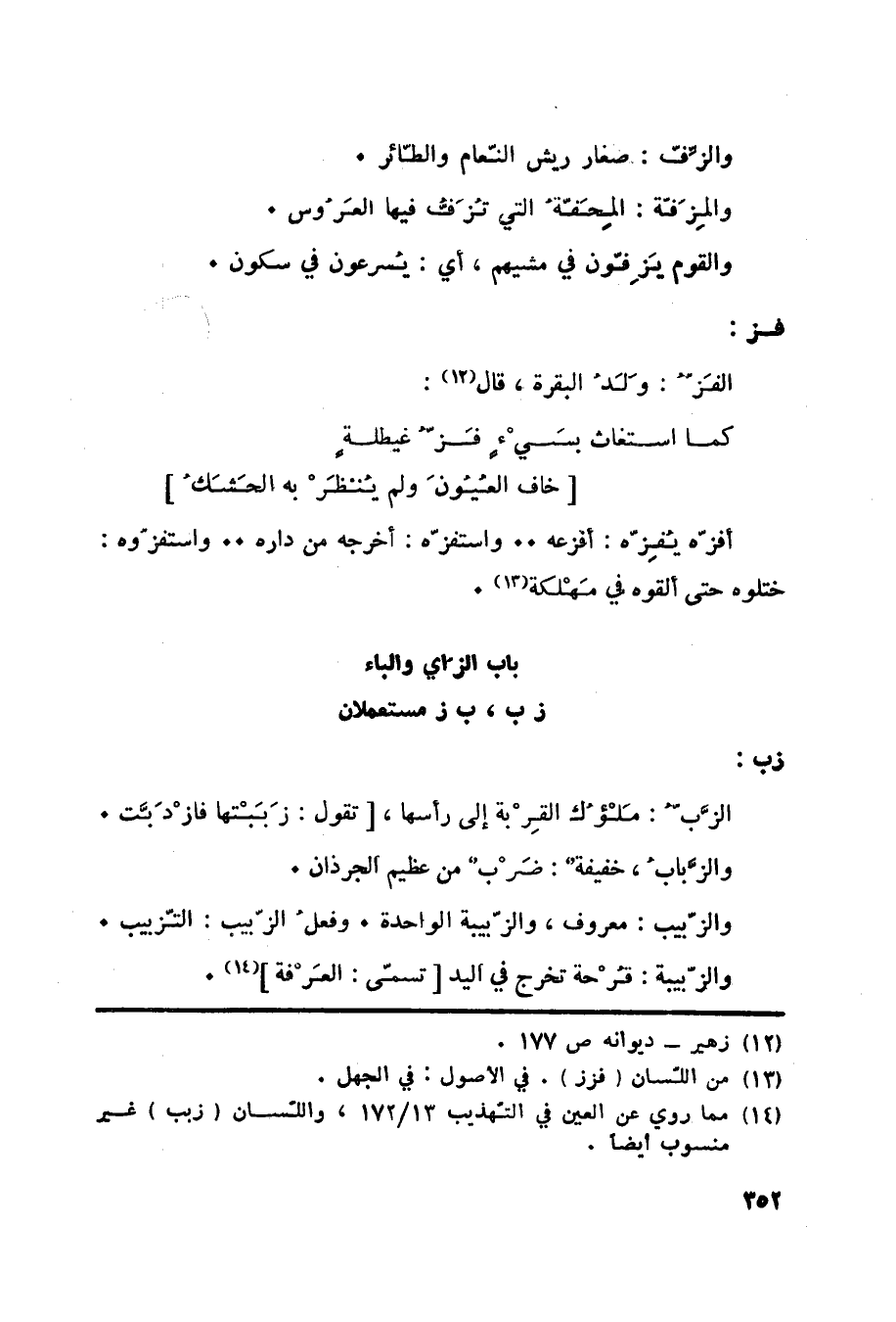 (14) مما روي عن العين في التهذيب 13/ 172، واللسان (زبب) غير منسوب أيضا.