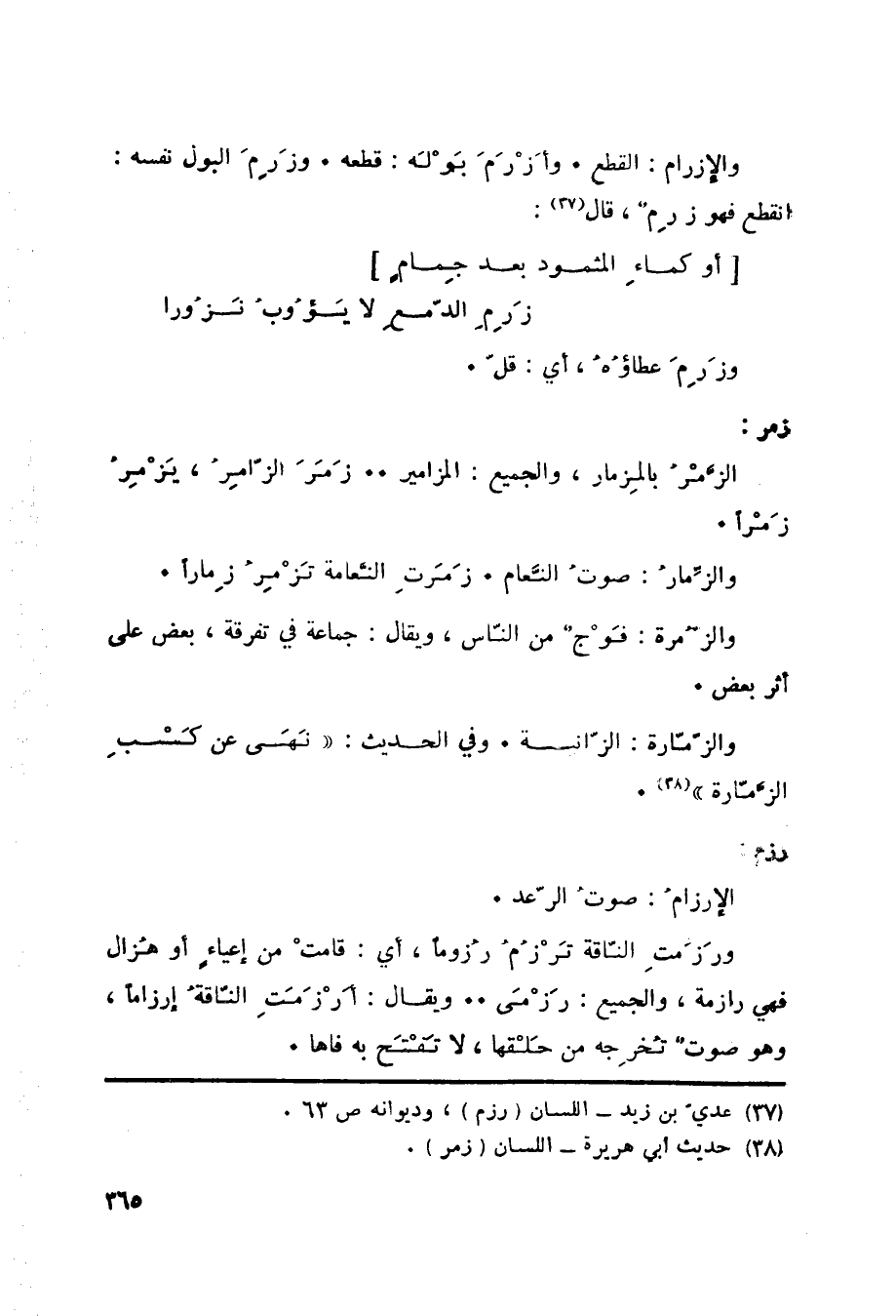 والإزرام: القطع. وأَزْرَمَ بَوْلَه: قطعه. وزَرِمَ البول نفسه: انقطع فهو زرم، قال «37» :