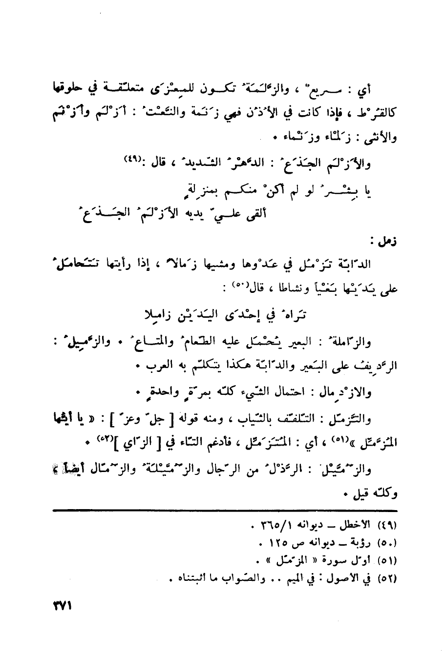 زمل: الدّابّة تَزْمُل في عَدْوها ومشيها زَمالاً، إذا رأيتها تَتَحامَلُ على يَدَيْها بَغْياً ونشاطا، قال «50» :