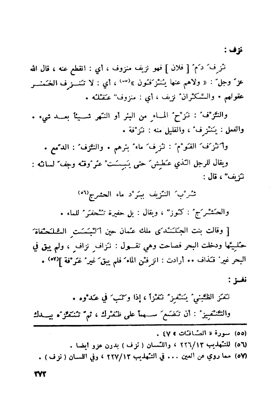 «55» ، أي: لا تَنزِف الخَمْر عقولهم. والسَّكْرانُ نزيف، أي: منزوفٌ عَقْلُه. والنَّزْفُ: نَزْحُ الماءِ من البئر أو النّهر شيئاً بعد شيء. والفعل: يَنْزِفُ، والقليل منه: نَزْفة. وأَنْزَفَ القَوْمُ: نُزِفَ ماءُ بئرهم. والنَّزفُ: الدّمع. ويقال للرجل الذّي عَطِشَ حتى يَبِسَتْ عُرُوقُه وجفّ لسانُه: نَزيفٌ، قال: