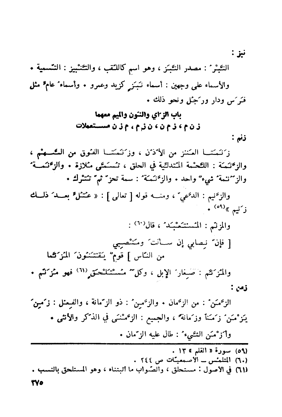 باب الزاي والنون والميم معهما ز ن م، ز م ن، ن ز م، م ز ن مستعملات