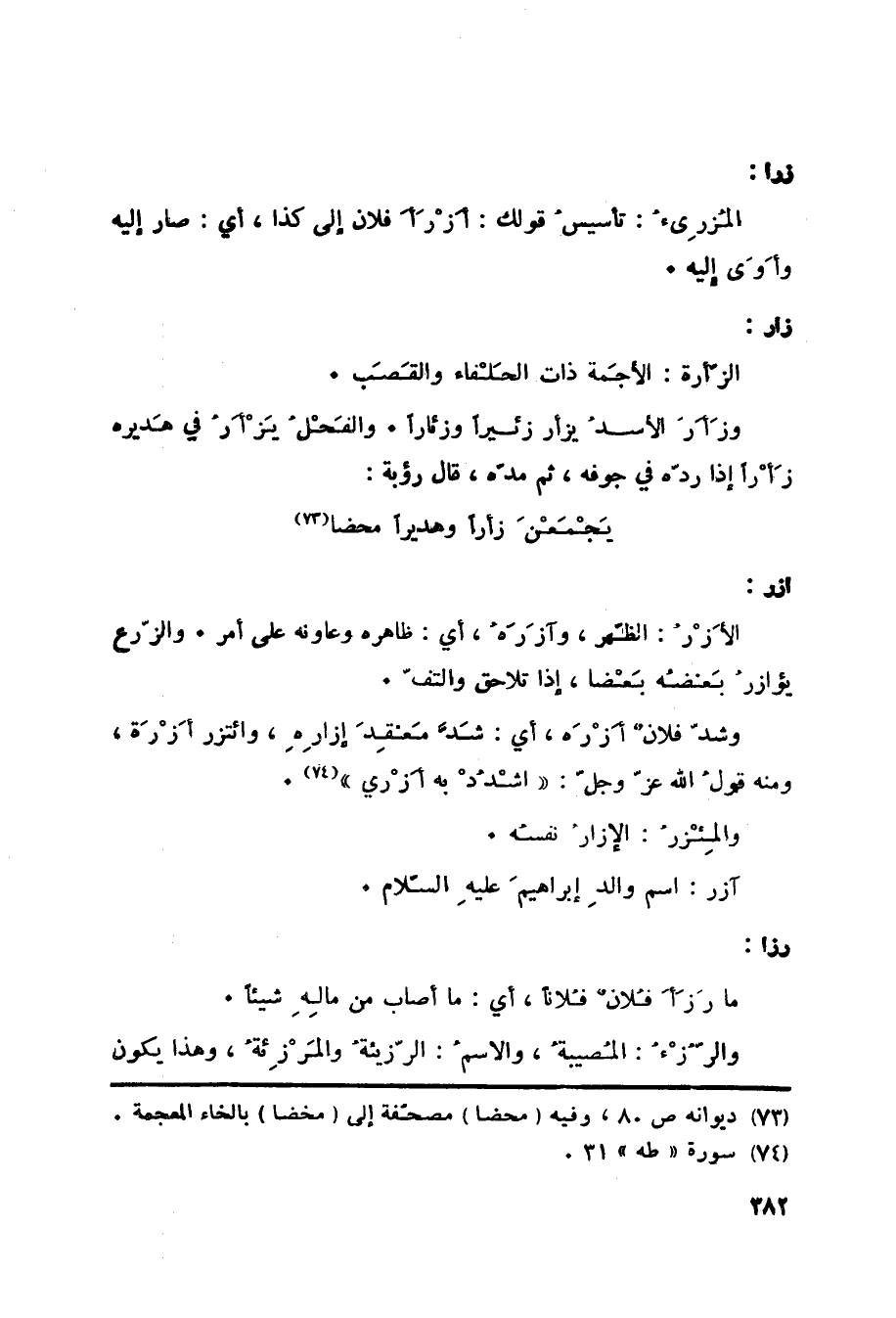 أزر: الأَزْرُ: الظّهر، وآزَرَهُ، أي: ظاهره وعاونه على أمر. والزّرع يؤازرُ بَعضُه بَعْضا، إذا تلاحق والتفّ. وشدّ فلانٌ أَزْرَه، أي: شَدَّ مَعقِدَ إزارِهِ، وائتزر أَزْرَة، ومنه قولُ الله عزّ وجلّ: اشْدُدْ بِهِ أَزْرِي «75» . والمِئْزرُ: الإزارُ نفسُه. آزر: اسم والدِ إبراهيمَ عليهِ السّلام.