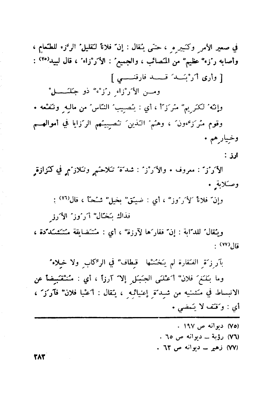 أرز: الأَرُزّ: معروف. والأَرْزُ: شدّةُ تَلاحُمٍ وتَلازُمٍ في كَزازةٍ وصَلابةٍ. وإنّ فلاناً لأَرُوزٌ، أي: ضيّقٌ بخيلٌ شُحّاً، قال «77» :
