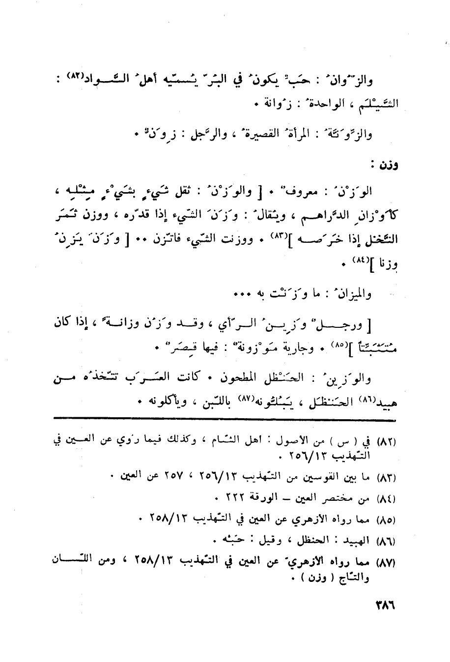 (88) مما رواه الأزهري عن العين في التهذيب 13/ 258، ومن اللسان والتاج (وزن) .