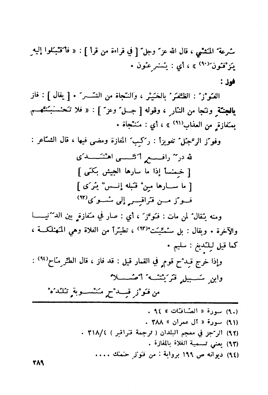 «92» ، أي: مَنْجاة. وفوّز الرَّجُلُ تفويزاً: رَكِبَ المفازة ومضى فيها، قال الشاعر: