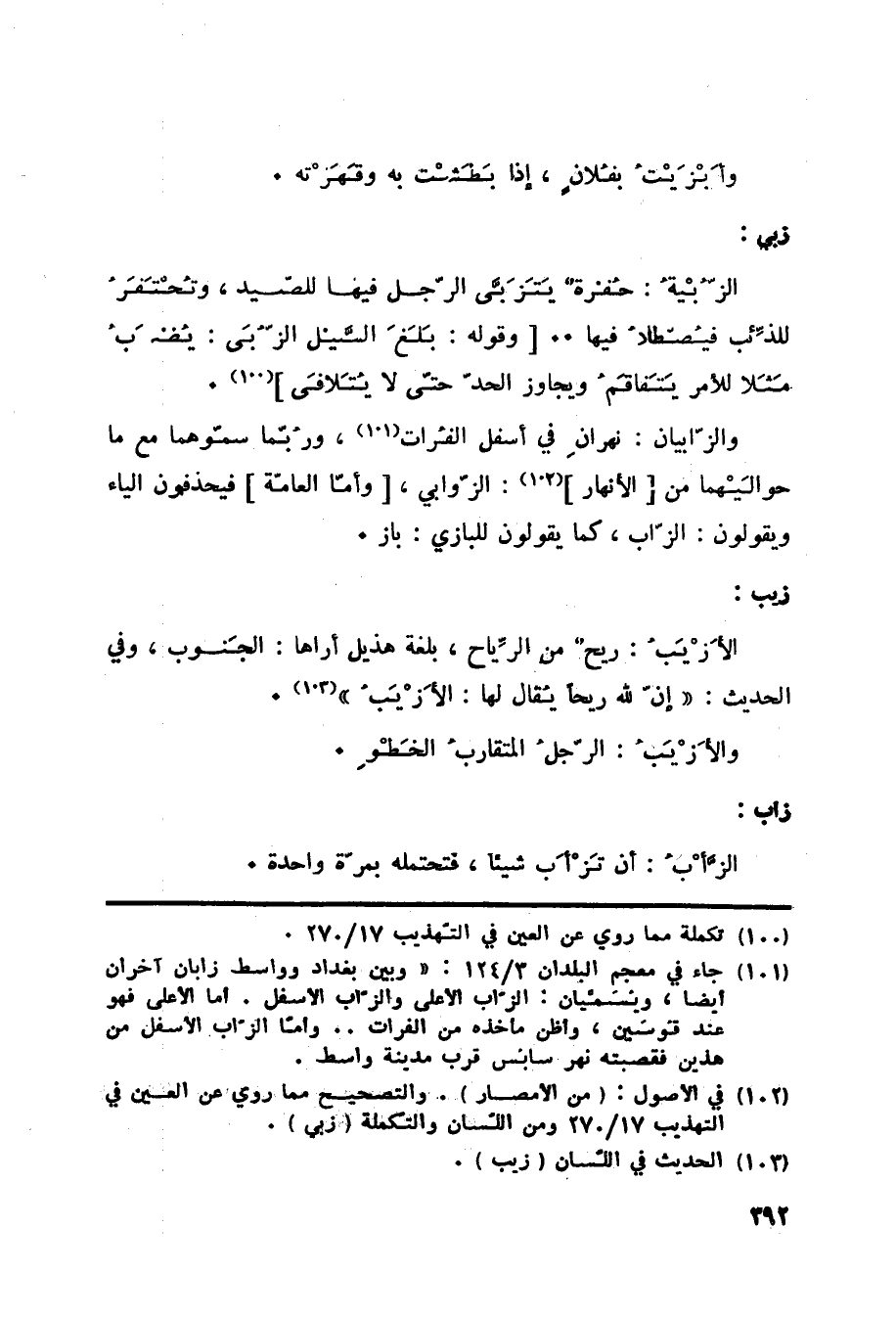 زبي: الزُّبْيةُ: حفرة يتزبى الرجل فيها للصّيد، وتُحْتَفَرُ للذِّئب فيُصْطادُ فيها. [وقوله: بَلَغَ السَّيل الزُّبَى: يُضرَبُ مَثَلا للأمر يَتَفاقَم ويجاوز الحدّ حتّى لا يُتَلافَى] «101» . والزّابيان: نهرانِ في أسفل الفُرات «102» ، ورُبّما سمّوهما مع ما حوالَيْهما من [الأنهار] «103» : الزّوابي، [وأمّا العامّة] فيحذفون الياء ويقولون: الزّاب، كما يقولون للبازي: باز.