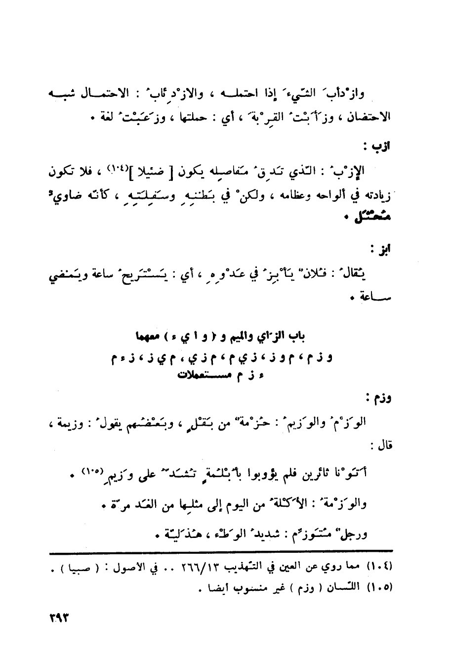 باب الزاي والميم و (وا يء) معهما وز م، م وز، ز ي م، م ز ي، م ي ز، زء م، ء ز م مستعملات