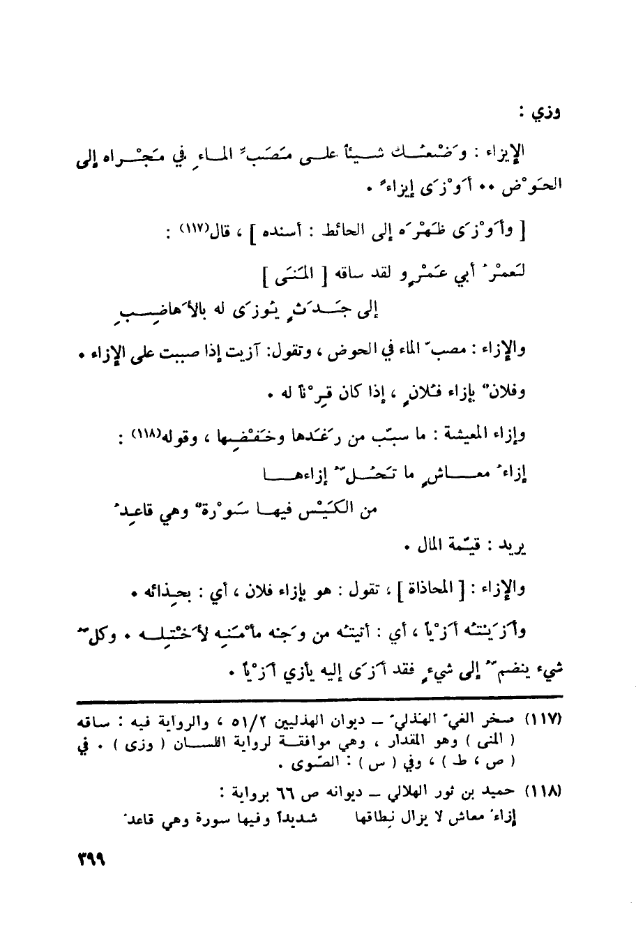 يريد: قيّمة المال. والإزاء: [المحاذاة] ، تقول: هو بإزاء فلان، أي: بحِذائه. وأَزَيتُه أَزْياً، أي: أتيتُه من وَجه مأْمَنِه لأَخْتِله. وكلُّ شيء ينضمُّ إلى شيءٍ فقد أزَى إليه يأزي أزيا. الوَزَى: من أسماء الحِمارِ المصك الشديد.
