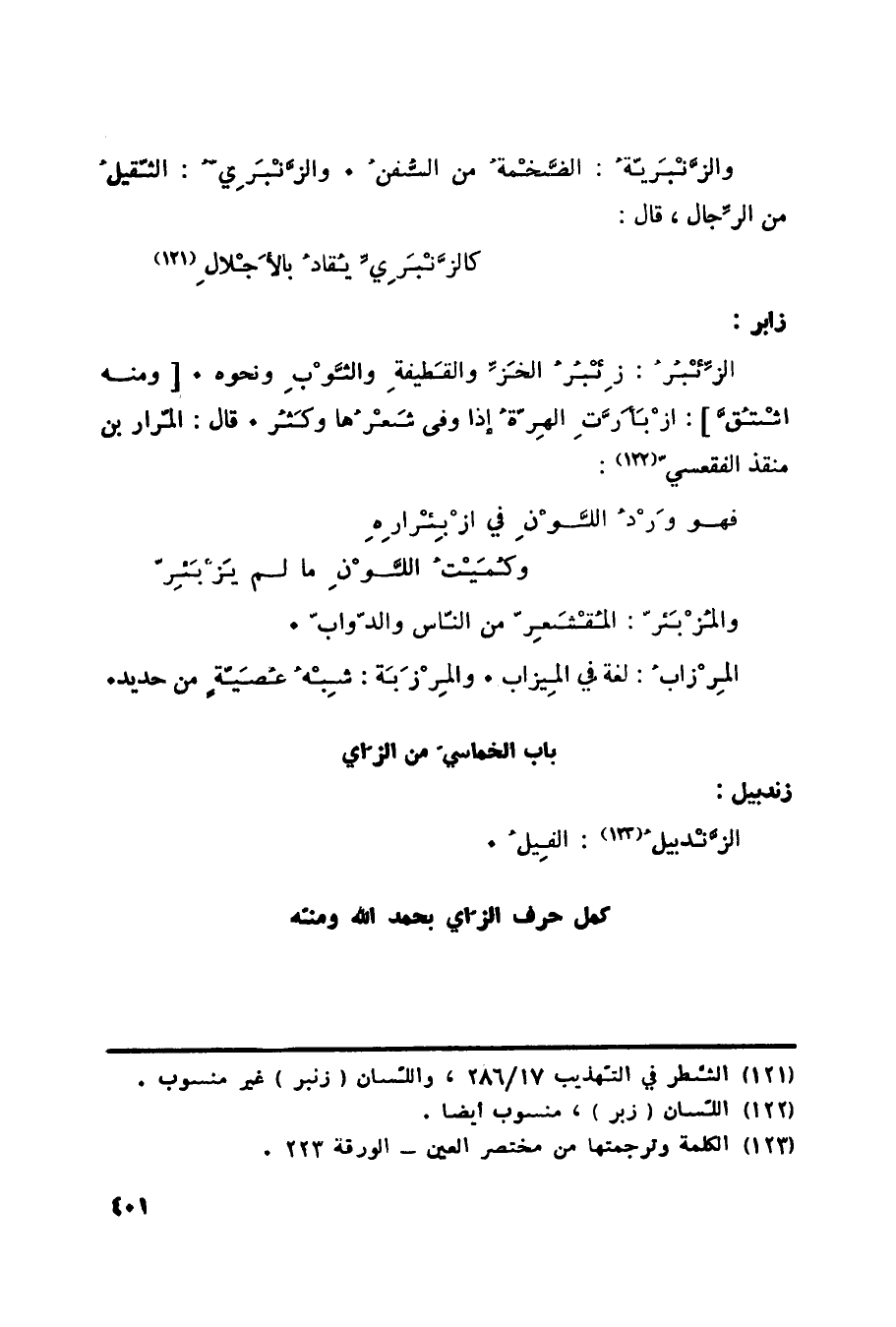 (122) الشطر في التهذيب 17/ 286، واللسان (زنبر) غير منسوب.