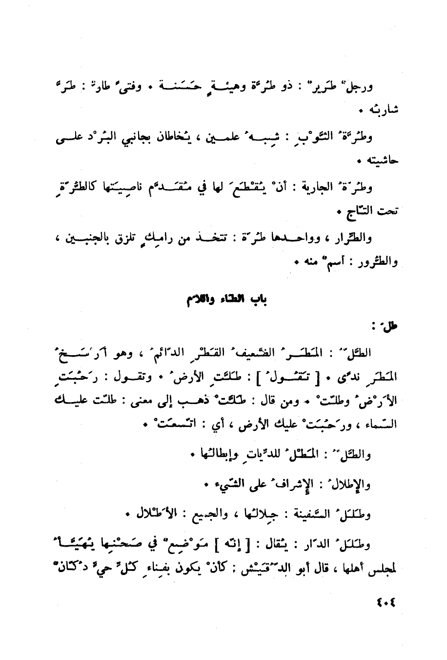 طل: الطَّلُّ: المَطَرُ الضَّعيفُ القَطْرِ الدّائمُ، وهو أَرْسَخُ المَطَرِ ندىً. [تقول] : طَلَّتِ الأرضُ. وتقول: رَحُبَتِ الأَرْضُ وطلّتْ. ومن قال: طَلَّتِ ذهب إلى معنى: طلّت عليك السّماء، ورَحُبَتْ عليك الأرض، أي: أتّسعَتْ. والطَّلُّ: المَطْلُ للدِّياتِ وإبطالُها. والإطلالُ: الإِشرافُ على الشّيء. وطَلَلُ السَّفينة: جِلالُها، والجميع: الأَطْلال. وطَلَلُ الدّار: يُقال: [إنّه] مَوْضِعٌ في صَحْنِها يُهَيَّأُ لمجلس أهلها، قال أبو الدُّقَيْش: كأنْ يكون بفِناءِ كُلِّ حيٍّ دُكّانٌ