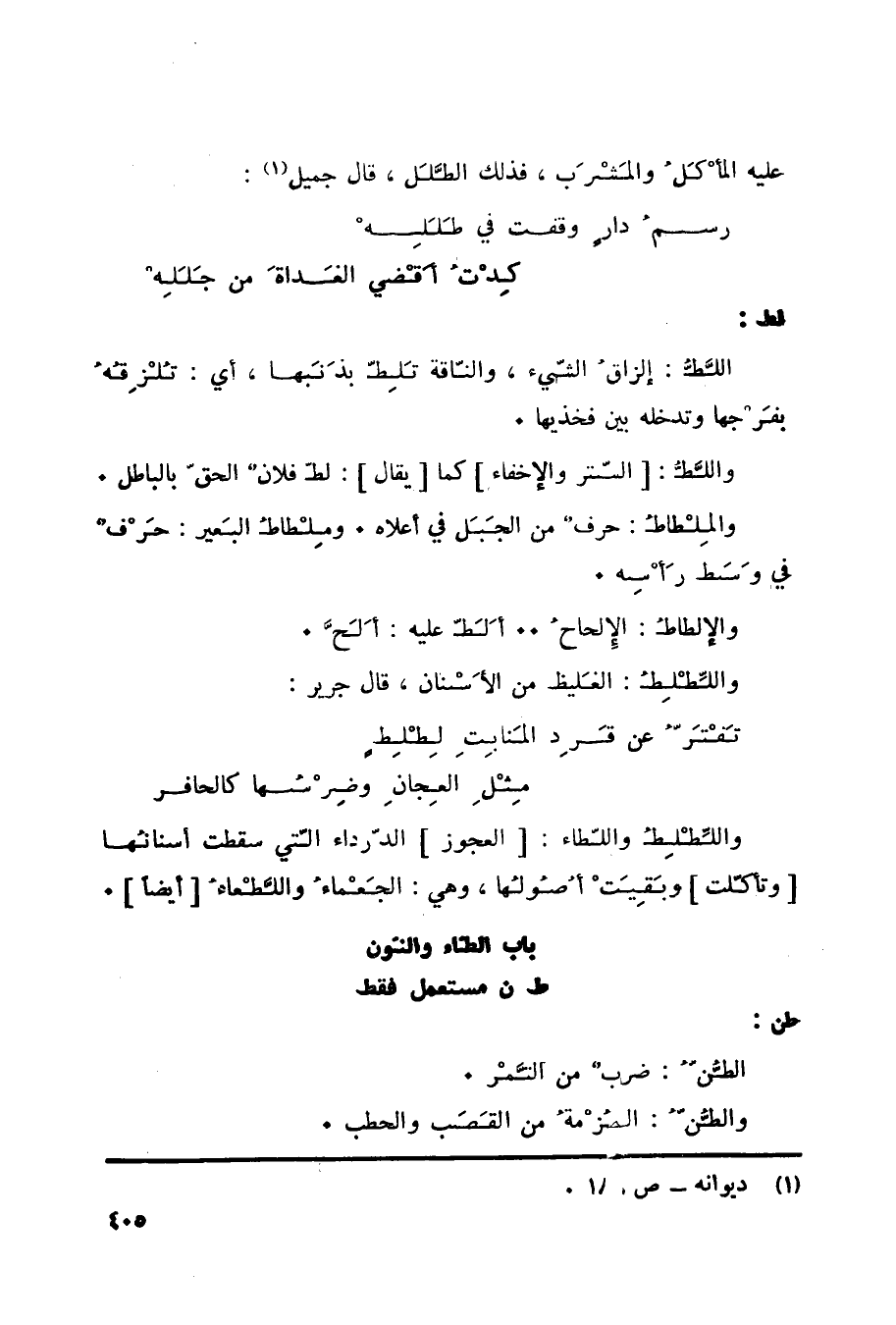 لط: اللَّطُّ: إلزاقُ الشّيء، والنّاقة تَلِطّ بذَنَبها، أي: تُلْزِقُهُ بفَرْجها وتدخله بين فخذيها. واللَّطُّ: [السّتر والإخفاء] كما [يقال] : لطّ فلانٌ الحقّ بالباطل. والمِلْطاطُ: حرفٌ من الجَبَل في أعلاه. ومِلْطاطُ البَعير: حَرْفٌ في وَسَط رأسه. والإلطاط: الإلحاح.. أَلَطّ عليه: أَلَحَّ. واللِّطْلِطُ: الغَليظ من الأَسْنان، قال جرير: