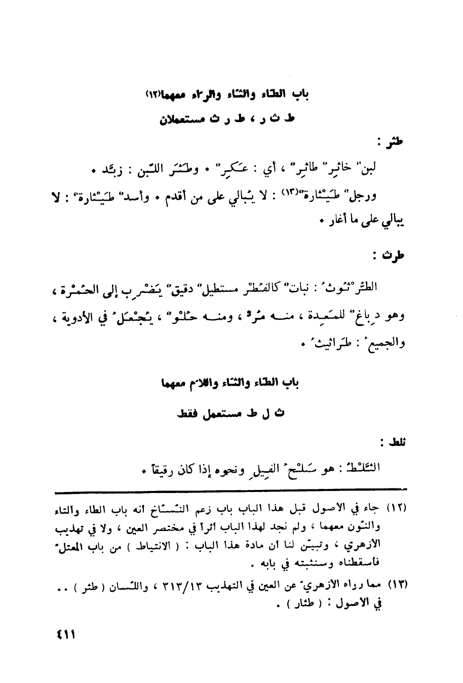 (13) مما رواه الأزهري عن العين في التهذيب 13/ 313، واللسان (طثر) في الأصول: (طثار) .
