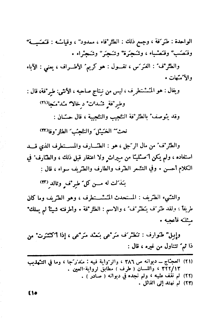 (21) (العجاج) ديوانه ص 386، والرواية فيه: مدرجا، وما في التهذيب 13/ 322، واللسان (طرف) مطابق لرواية العين.