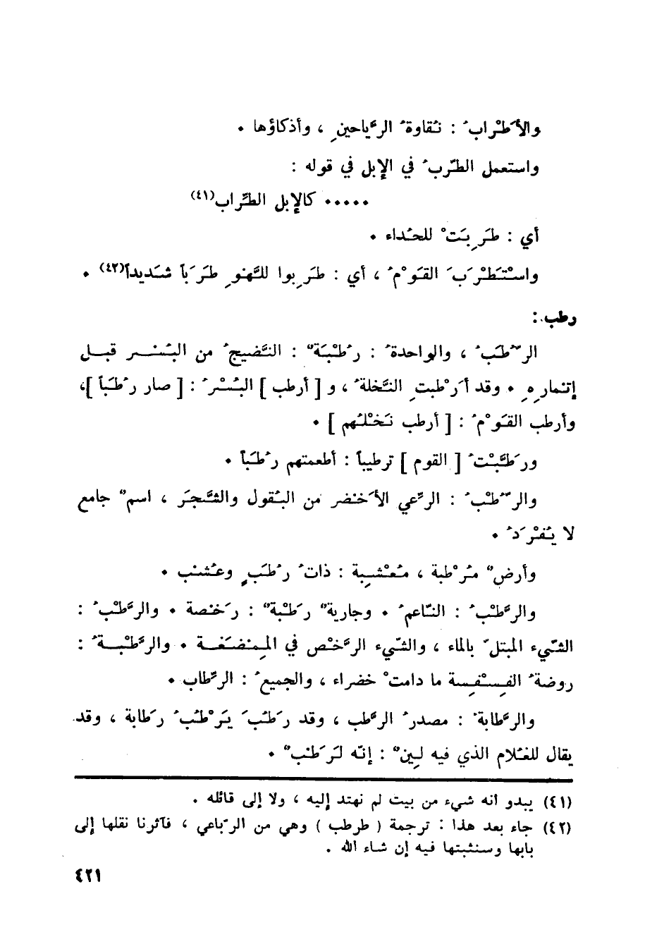 (42) جاء بعد هذا: ترجمة (طرطب) وهي من الرباعي، فآثرنا نقلها إلى بابها وسنثبتها فيه إن شاء الله.