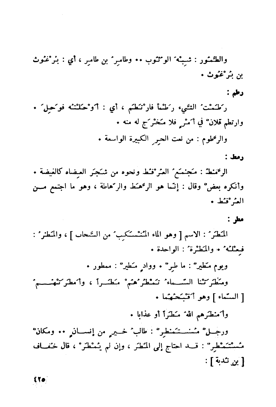 مطر: المَطَرُ: الاسم [وهو الماء المُنْسَكِبُ من السَّحاب] ، والمَطرُ: فِعْلُهُ. والمطرة: الواحدة. ويوم مَطيرٌ: ماطِرٌ. ووادٍ مَطيرٌ: ممطور. ومَطَرَتْنا السّماءُ تَمْطُرُهُمْ مَطَراً، وأَمطَرَتْهُمُ [السّماء] وهو أَقْبَحُهُما. وأَمطَرهم اللهُ مَطَراً أو عذاباً. ورجلٌ مُستَمطِرٌ: طالبُ خيرٍ من إنسانٍ. ومكانٌ مُسْتَمْطِرٌ: قد احتاج إلى المَطَر، وإن لم يُمْطَرْ، قال خُفاف [بن نُدبة:]