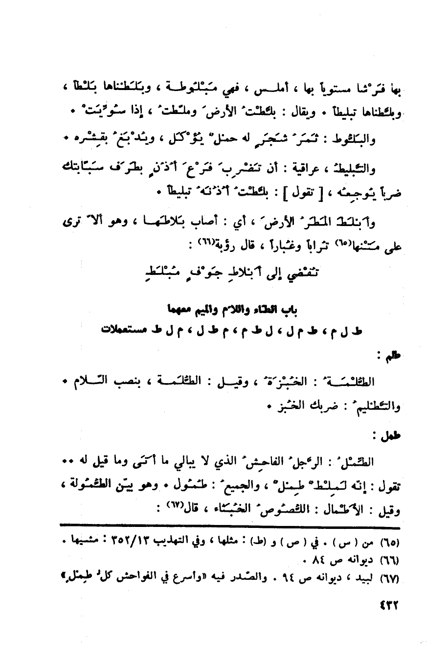 باب الطاء واللام والميم معهما ط ل م، ط م ل، ل ط م، م ط ل، م ل ط مستعملات