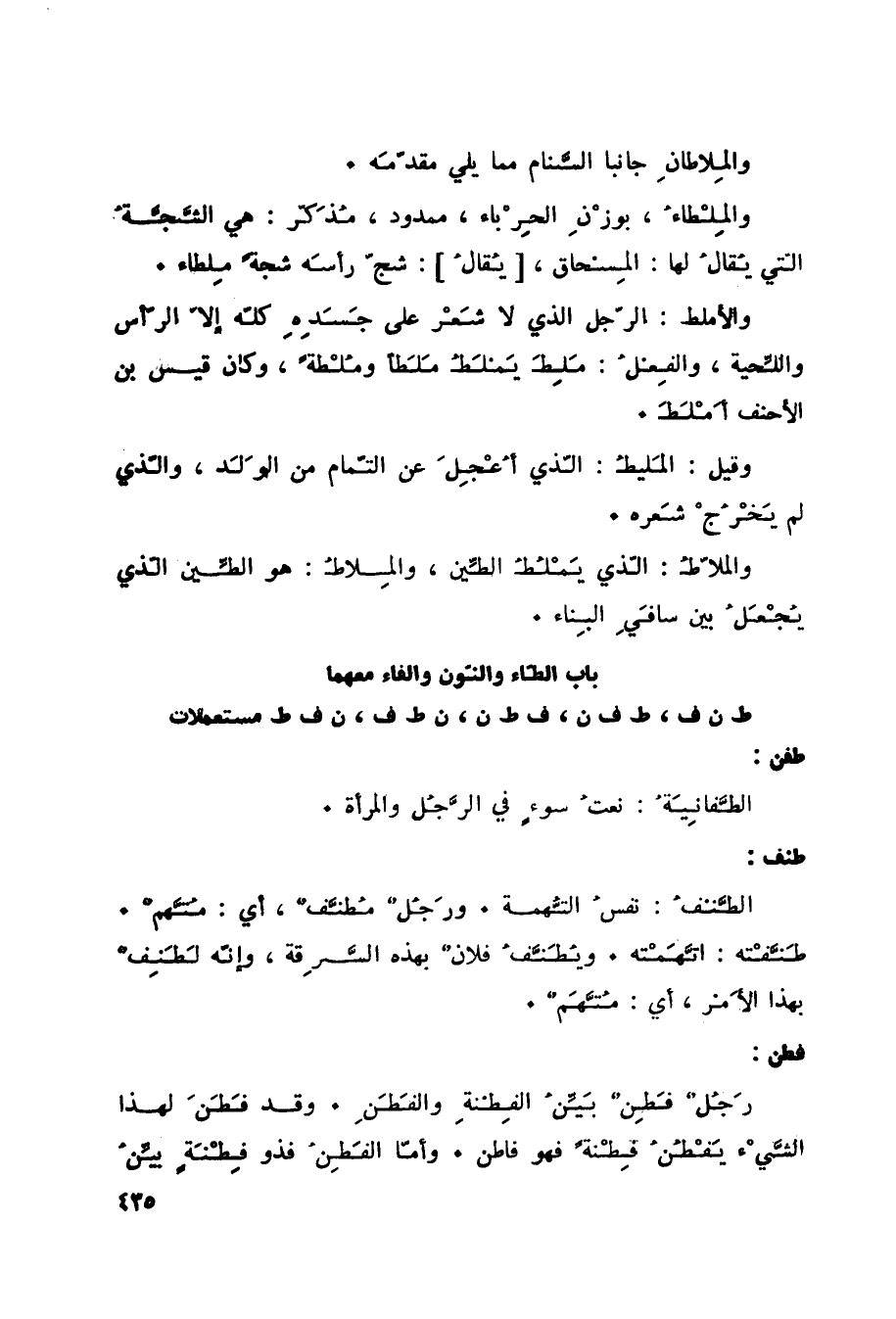 باب الطاء والنون والفاء معهما ط ن ف، ط ف ن، ف ط ن، ن ط ف، ن ف ط مستعملات