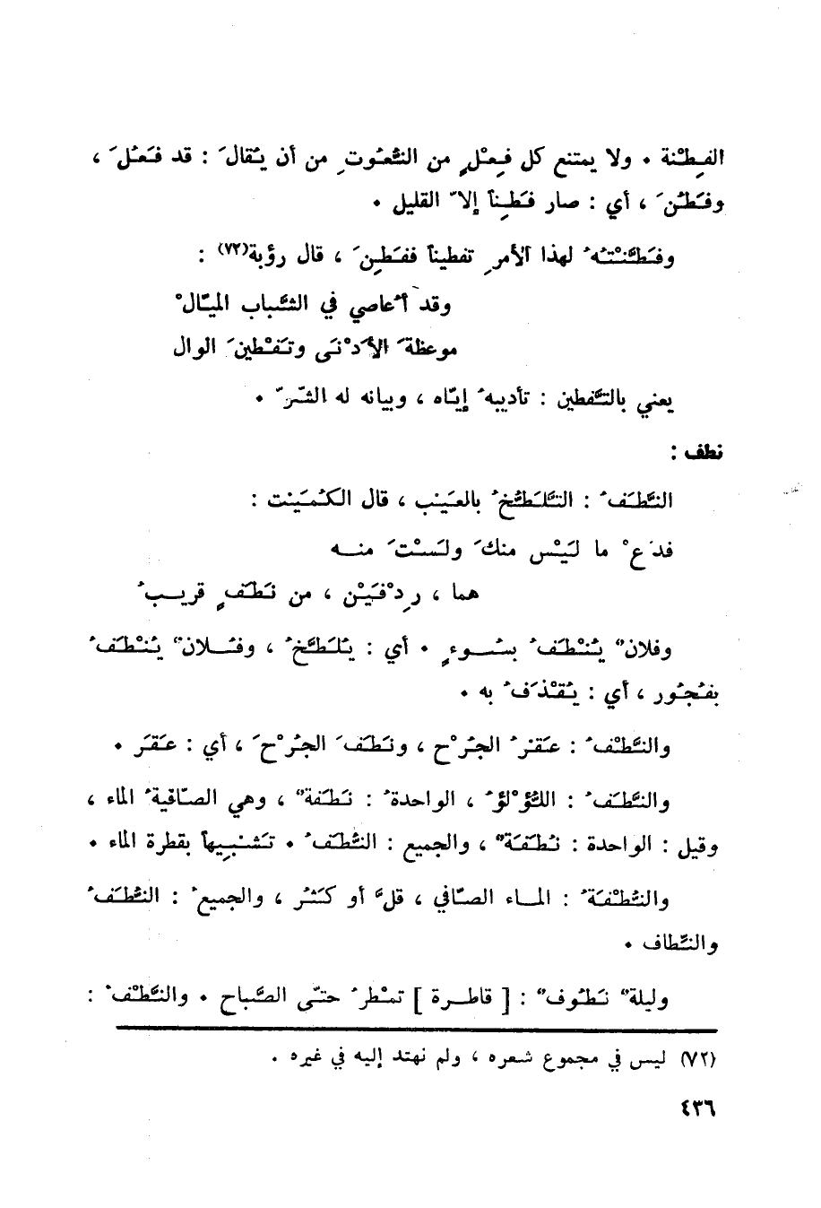 وفلانٌ يُنْطَفُ بسُوءٍ. أي: يُلَطَّخُ، وفُلانٌ يُنْطَفُ بفُجُور، أي: يُقْذَفُ به. والنَّطْفُ: عَقرُ الجُرْح، ونَطَفَ الجُرْحَ، أي: عَقَر. والنَّطَفُ: اللُّؤْلؤُ، الواحدةُ: نَطَفةٌ، وهي الصّافيةُ الماء، وقيل: الواحدة: نُطَفَةٌ، والجميع: النُّطَفُ. تَشبِيهاً بقطرة الماء. والنُّطْفَةُ: الماء الصّافي، قلَّ أو كَثُر، والجميعُ: النُّطَفُ والنِّطاف. وليلةٌ نَطُوفٌ: [قاطرة] تمْطرُ حتّى الصباح. والنطف: