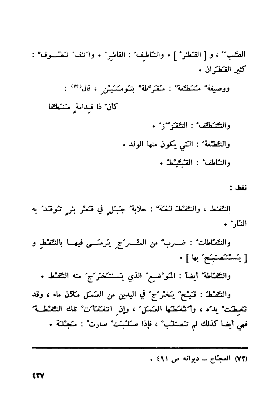 الصب، و [القطر] . والنّاطِفُ: القاطِرُ. وأَنفُ نَطُوفٌ: كثير القَطَران. ووصيفةٌ مُنَطَّفةٌ: مُقَرَّطةٌ بتُومَتَيْنِ، قال «73» :