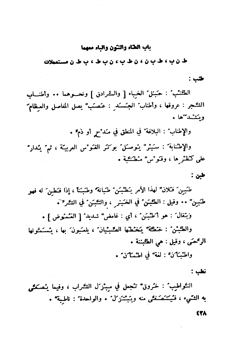 باب الطاء والنون والباء معهما ط ن ب، ط ب ن، ن ط ب، ن ب ط، ب ط ن مستعملات