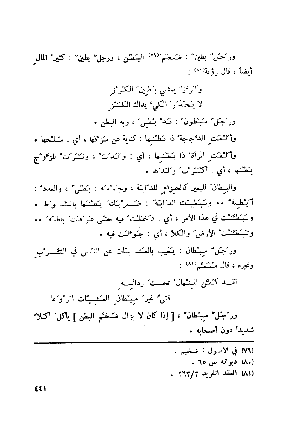ورَجُلٌ مَبْطونٌ: قَدْ بُطِنَ، وبه البطن. وأَلْقَتِ الدَّجاجةُ ذا بَطْنِها: كناية عن مَزْقها، أي: سَلْحها. وأَلْقَتِ المرأةُ ذا بَطْنِها، أي: وَلَدَتْ، ونَثَرَتْ للزَّوْج بَطْنها، أي: أكْثَرَتْ وَلَدَها. والبِطانُ للبعير كالحِزامِ للدّابّة، وجَمْعُه: بُطُنٌ، والعددُ: أَبْطِنهٌ.. وتَبْطينُك الدّابّةُ: ضَرْبُكَ بَطْنَها بالسَّوْط. وتَبَطَّنْت في هذا الأمر، أي: دَخَلْتُ فيه حتّى عَرَفْتُ باطنَهُ. وتَبَطَّنْتُ الأرضَ والكلأ، أي: جَوَّلْت فيه. ورَجُلٌ مِبْطان: يَغيب بالعَشيّات عن النّاس في الشُّرْبِ وغيره، قال مُتَمِّم: «81»