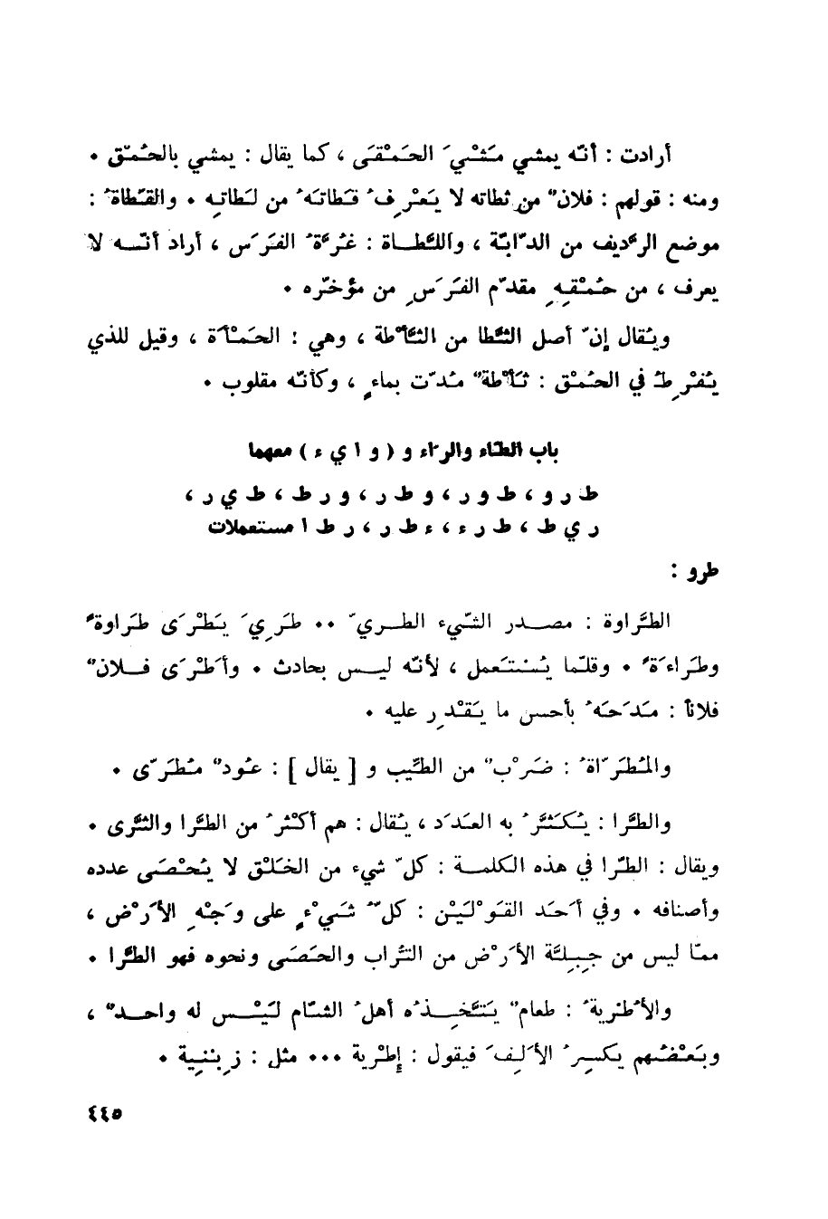 باب الطاء والراء و (وا يء) معهما ط ر و، ط ور، وط ر، ور ط، ط ي ر، ر ي ط، ط رء، ء ط ر، ر ط امستعملات