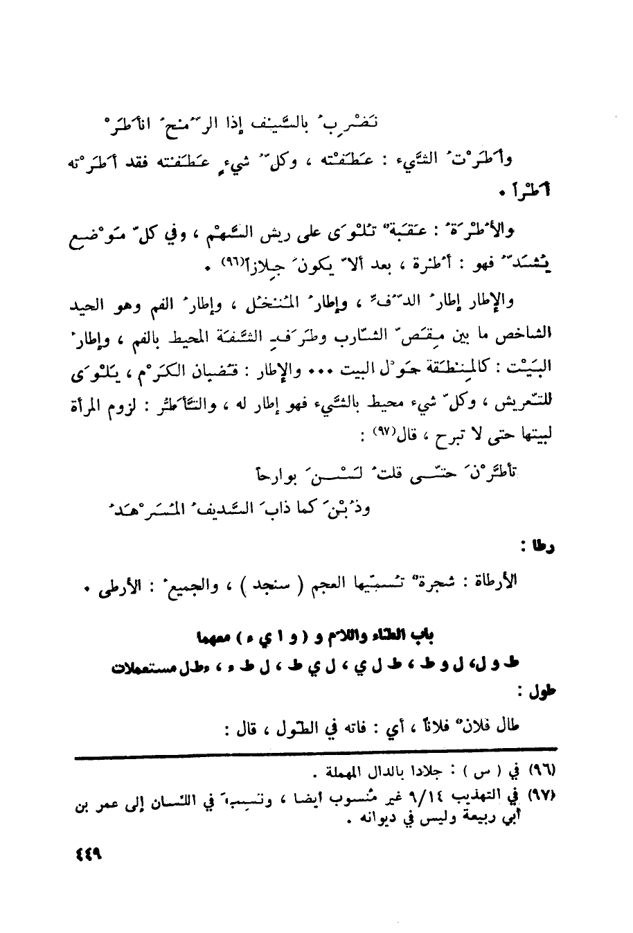 وأَطَرْتُ الشَّيء: عَطَفْته، وكلُّ شيءٍ عَطَفته فقد أَطَرْته أَطْرأ. والأُطْرَةُ: عَقَبةٌ تُلْوَى على ريش السَّهْم، وفي كلّ مَوْضع يُشَدُّ فهو: أُطرة، بعد ألاّ يكونَ جِلازاً «96» . والإطار إطارُ الدُّفِّ، وإطارُ المُنخُل، وإطارُ الفم وهو الحيد الشاخص ما بين مِقَصّ الشّارب وطَرَفِ الشَّفَة المحيط بالفم، وإطارُ البَيْت: كالمِنطَقة حَوْل البيت. والإطار: قُضبان الكَرْم، يَلْوَى للتّعريش، وكلّ شيء محيط بالشَّيء فهو إطار له، والتَّأطُّر: لزوم المرأة لبيتها حتى لا تبرح، قال «97» :