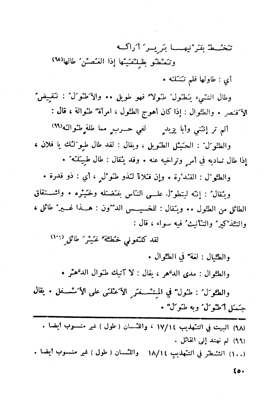(98) البيت في التهذيب 14/ 17، واللسان (طول) غير منسوب أيضا.