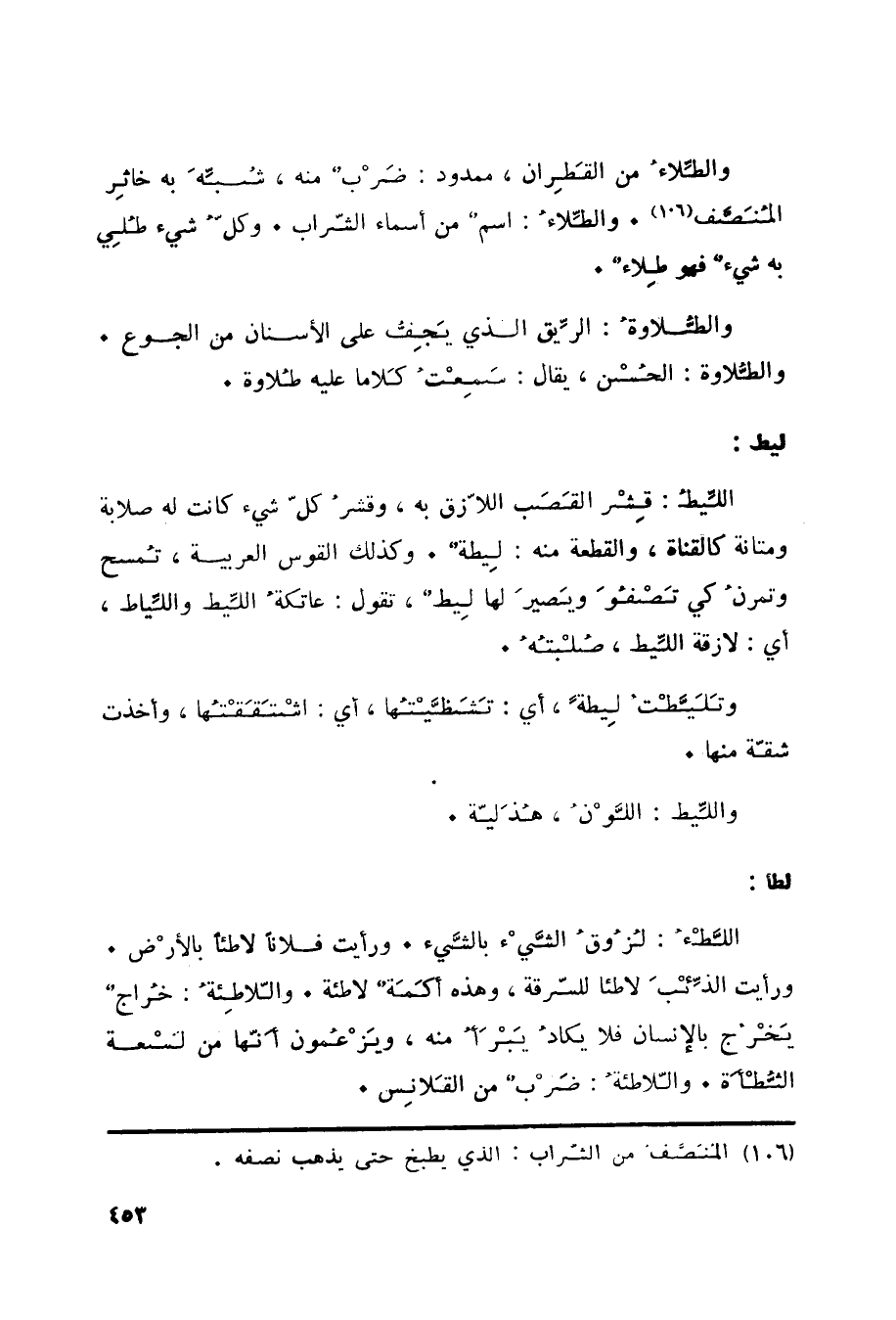 والطِّلاءُ من القَطِران، ممدود: ضَرْبٌ منه، شُبِّهَ به خاثِر المُنَصَّف «106» . والطِّلاءُ: اسمٌ من أسماء الشّراب. وكلُّ شيء طُلِي به شيءٌ فهو طِلاءٌ. والطُّلاوةُ: الرِّيق الذي يَجِفُّ على الأسنان من الجوع. والطُّلاوة: الحُسْن، يقال: سَمِعْتُ كَلاما عليه طُلاوة.