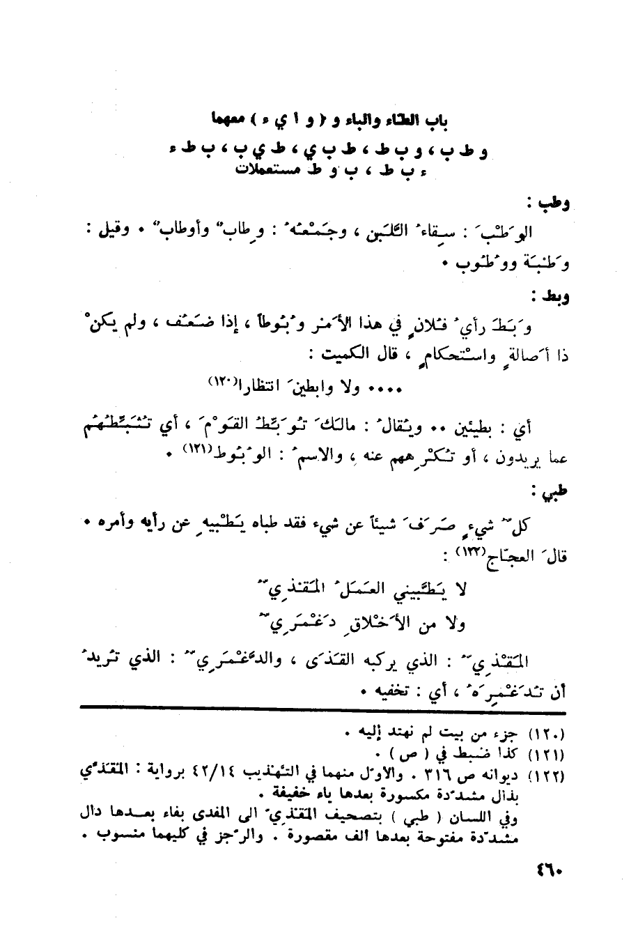 باب الطاء والباء و (وا يء) معهما وط ب، وب ط، ط ب ي، ط ي ب، ب طء، ء ب ط، ب وط مستعملات