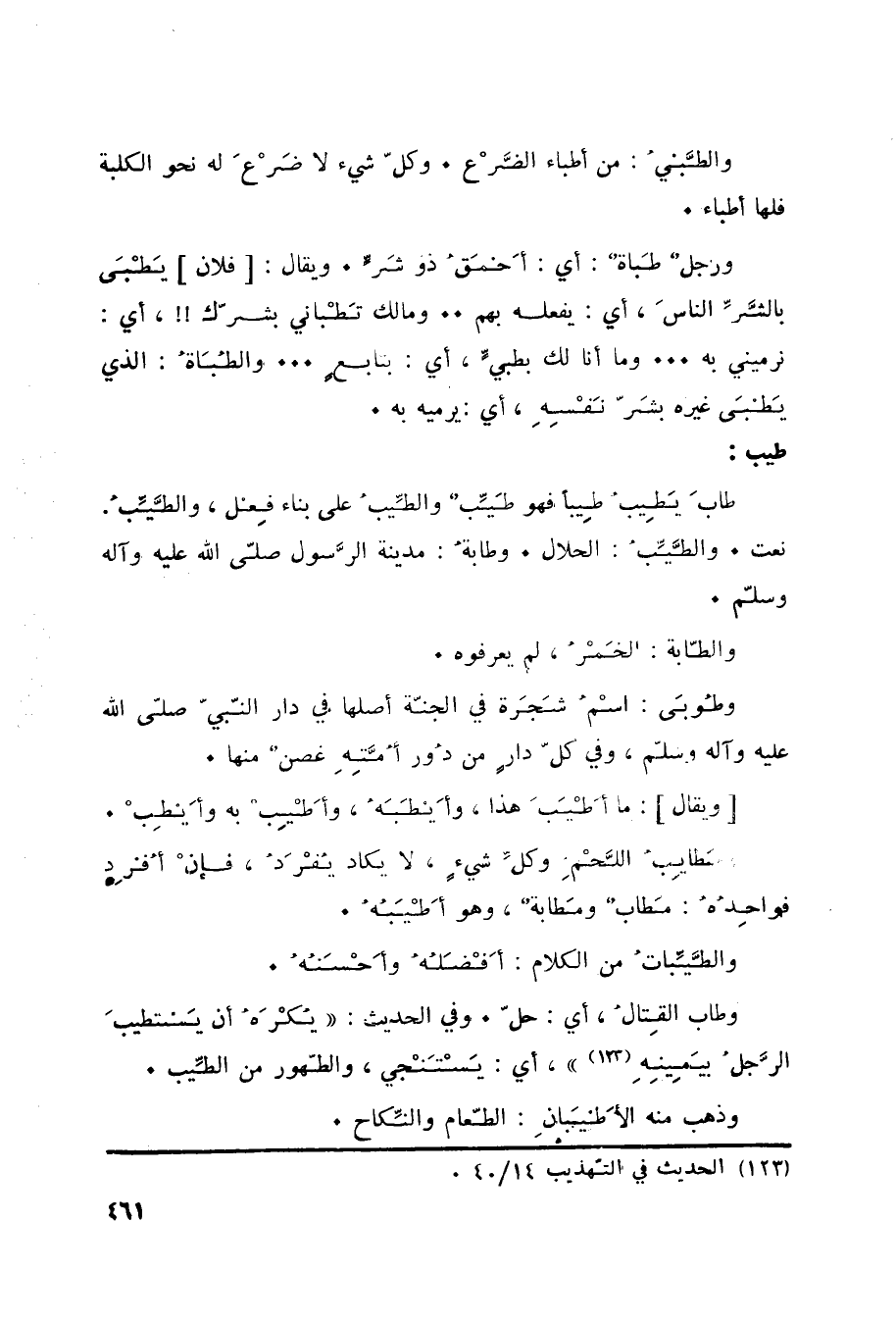 طيب: طابَ يَطيبُ طِيباً فهو طَيِّبٌ والطِّيبُ على بناء فِعل، والطَّيِّبُ. نعت. والطَّيِّبُ: الحلال. وطابةُ: مدينة الرَّسول صلّى الله عليه وآله وسلّم. والطّابة: الخَمْرُ، لم يعرفوه. وطُوبَى: اسْمُ شَجَرة في الجنّة أصلها في دار النّبيّ صلّى الله عليه وآله وسلم، وفي كلّ دارٍ من دُور أُمَّتِهِ غصنٌ منها. [ويقال] : ما أَطْيَبَ هذا، وأَيطَبَهُ، وأَطْيِبٌ به وأَيطِبْ. ومَطايِبُ اللَّحْمِ وكلِّ شيءٍ، لا يكاد يُفْرَدُ، فإنْ أُفرِد فواحِدُةُ: مَطابٌ ومَطابةٌ، وهو أَطْيَبُهُ. والطَّيِّباتُ من الكلام: أَفْضَلُهُ وأَحْسَنُهُ. وطاب القِتالُ، أي: حلّ.