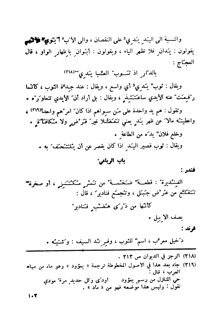 والنسبة إلى اليَدِ يَدِيٌّ على النقصان، وإلى الأَبِّ أَبَويٌّ، لأنّهم يقولون: يَدانِ فلا تظهر الياء، ويقولون: أبَوانِ باِظهارِ الواو، قال العجّاج: