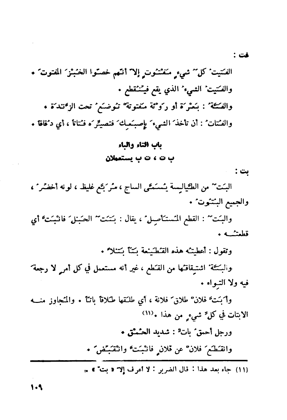 بت: البَتُّ من الطَّيالِسة يُسَمَّى الساج، مُرَبَّع غليظ، لونه أخضَرُ، والجميع البُتُوتُ. والبَتُّ: القطع المُستَأصِلُ، يقال: بَتَتُّ الحَبلَ فانْبَتَّ أي قطعتُه. وتقول: أعطيتُه هذه القُطَيعة بَتاً بَتلاً. والبَتَّةُ اشتِقاقُها من القَطع، غير أنه مستعمل في كل أمرٍ لا رجعةَ فيه ولا التِواء. وأَبَتَّ فلانٌ طلاقَ فلانة، أي طلَقها طَلاقاً باتّاً. والمُجاوز منه الابتات في كلِّ شيءٍ من هذا «11» . ورجل أحمقُ باتٌّ: شديد الحُمْق. وانقَطَعَ فلانٌ عن فلانٍ فانْبَتَّ وانقبض.