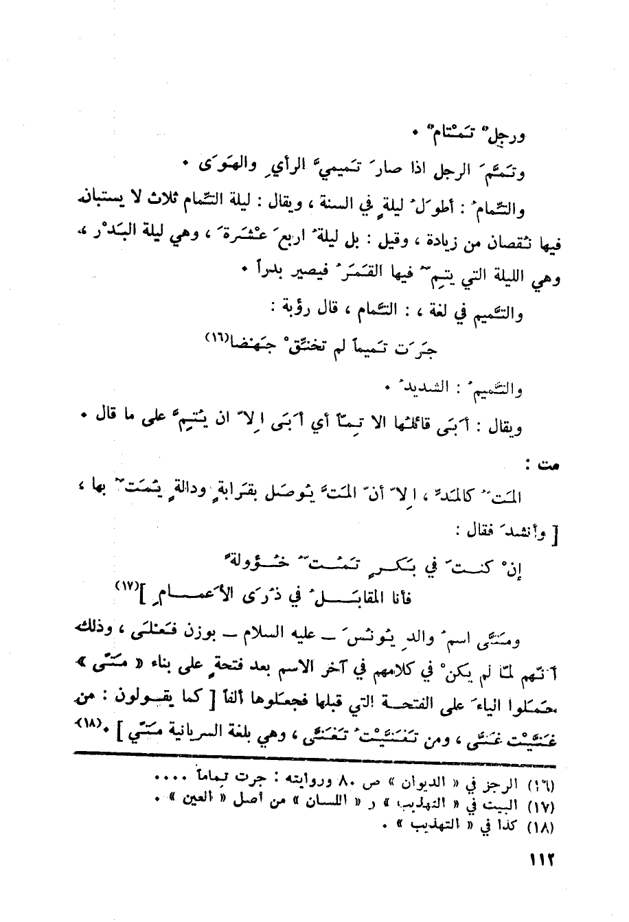 ورجلٌ تَمْتامٌ. وتَمَّمَ الرجل إذا صارَ تَميميَّ الرأيِ والهَوَى. والتِّمامُ: أطوَلُ ليلةٍ في السنة، ويقال: ليلة التِّمام ثلاث لا يستبان فيها نُقصان من زيادة، وقيل: بل ليلةُ أربعَ عْشَرةَ، وهي ليلة البَدْر، وهي الليلة التي يتِمُّ فيها القَمَرُ فيصير بدراً. والتَّميم في لغة،: التَّمام، قال رؤبة: